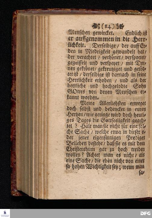 Das Kündlich=grosse Geheimniß Der Gottseeligkeit / Am dritten Weyhenacht=Feyertage ANNO 1698. In einer Predigt Uber das Evangelium Joh.I, 1--14. In der St. Georgen=Kirche zu Glaucha an Halle / vorgestellet von M.August Hermann Francken / S.S.Theol.P.P.Ord.& P.Glauch. HALLE / Gedruckt bey Christoph Salfelden / Königl.Preuß.Hoff-u.Reg.Buchd. 1702