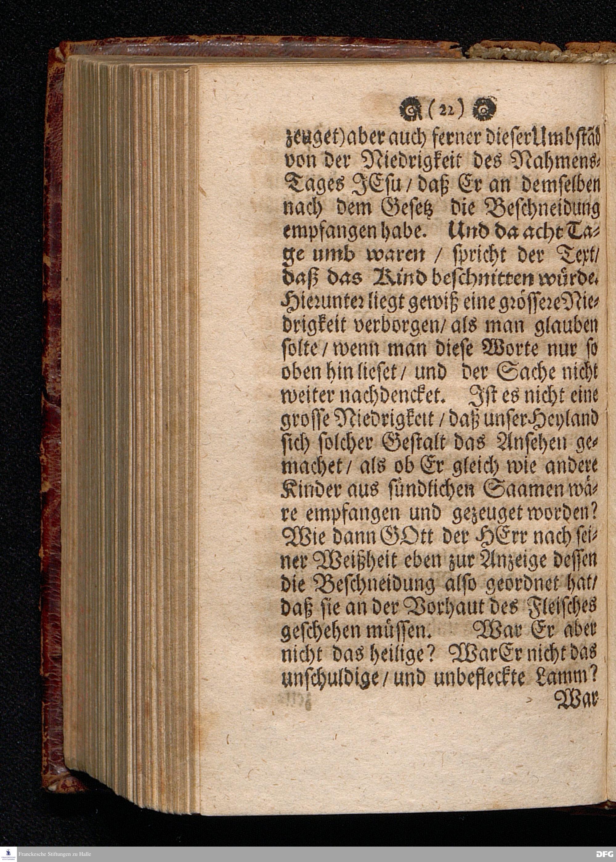 Der Nahmens=Tag Des HErrn JEsu In seiner Niedrigkeit und Herrligkeit / In einer Predigt Uber das Evangelium Luc.II, v.21. Am Neuen Jahrs Tage Anno 1701. In der St.Georgen=Kirche zu Glaucha an Halle vorgestellet von M.Aug.Hermann Francken / SS.Theol.P.Ord.& P.Glauch. HALLE / Gedruckt bey Christian Henckeln / Univers. Buchdr. 1702.