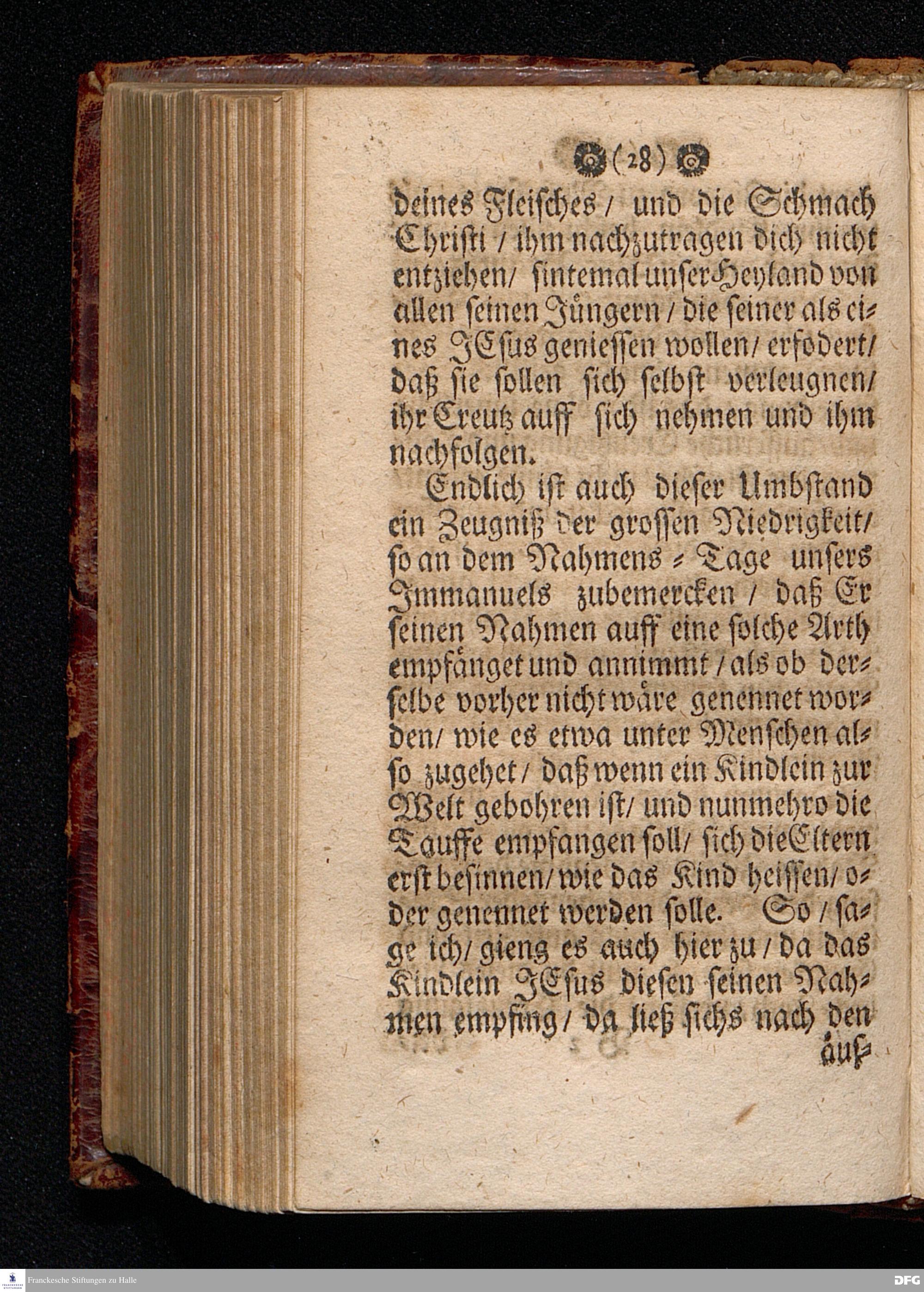 Der Nahmens=Tag Des HErrn JEsu In seiner Niedrigkeit und Herrligkeit / In einer Predigt Uber das Evangelium Luc.II, v.21. Am Neuen Jahrs Tage Anno 1701. In der St.Georgen=Kirche zu Glaucha an Halle vorgestellet von M.Aug.Hermann Francken / SS.Theol.P.Ord.& P.Glauch. HALLE / Gedruckt bey Christian Henckeln / Univers. Buchdr. 1702.