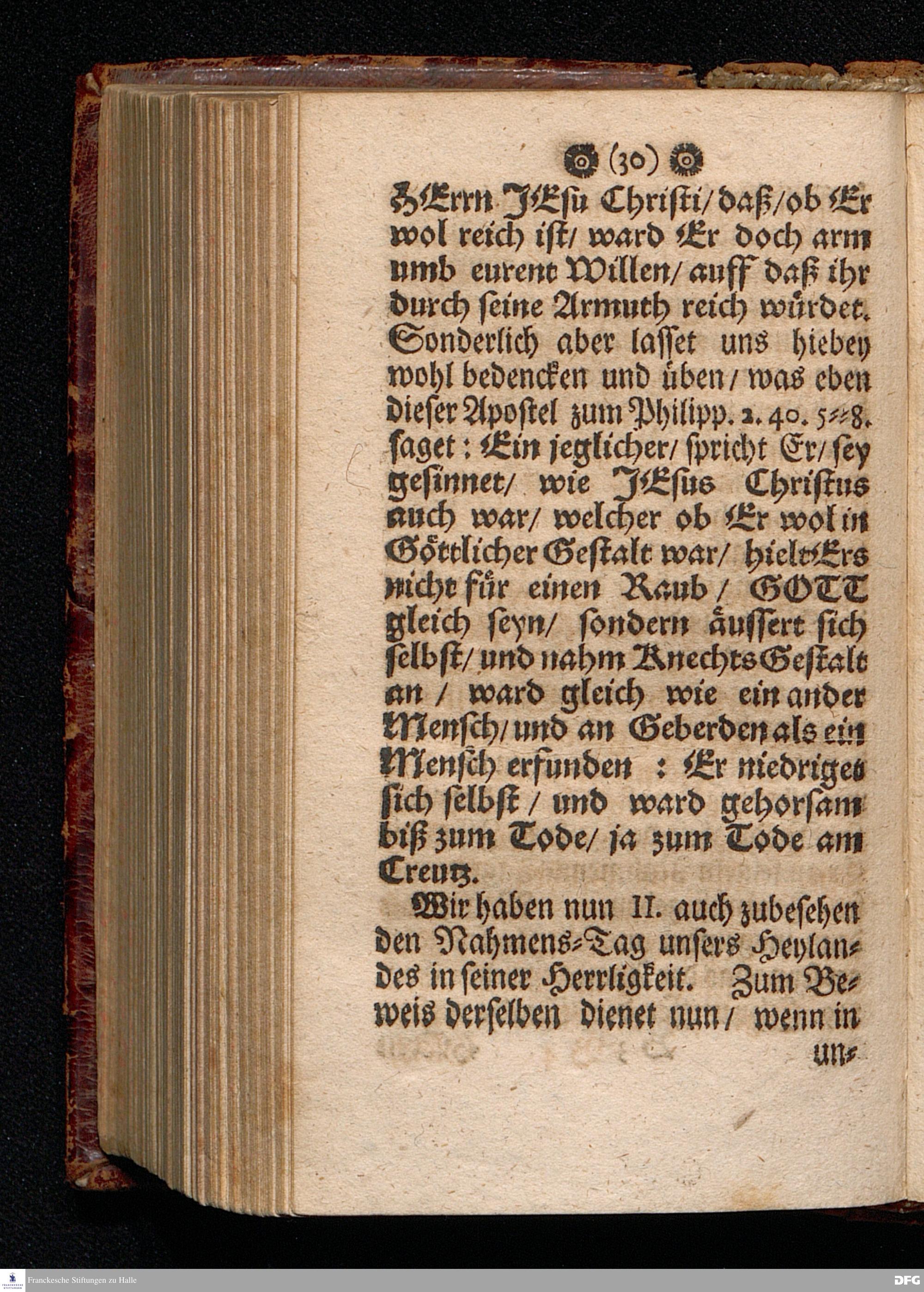 Der Nahmens=Tag Des HErrn JEsu In seiner Niedrigkeit und Herrligkeit / In einer Predigt Uber das Evangelium Luc.II, v.21. Am Neuen Jahrs Tage Anno 1701. In der St.Georgen=Kirche zu Glaucha an Halle vorgestellet von M.Aug.Hermann Francken / SS.Theol.P.Ord.& P.Glauch. HALLE / Gedruckt bey Christian Henckeln / Univers. Buchdr. 1702.