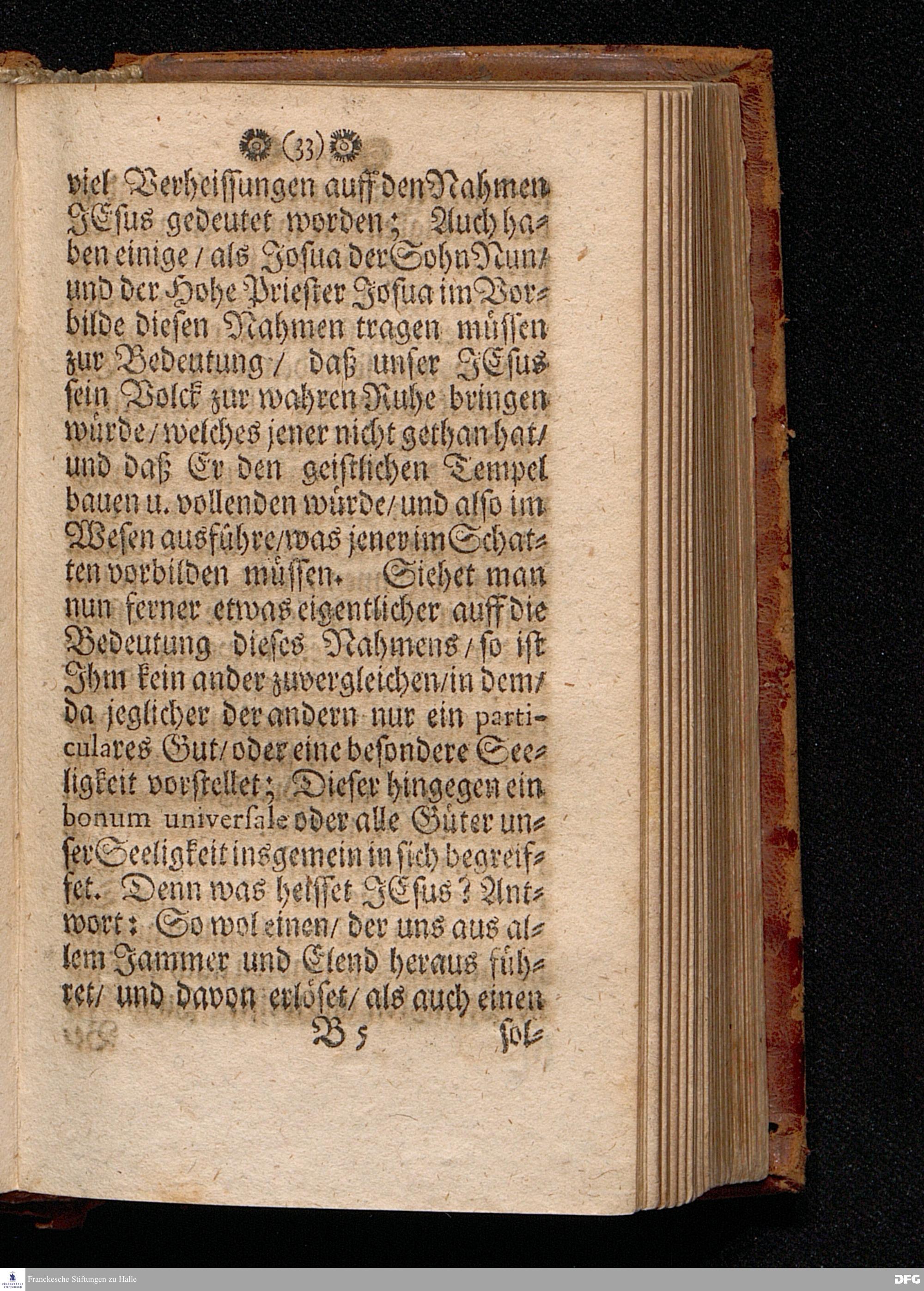 Der Nahmens=Tag Des HErrn JEsu In seiner Niedrigkeit und Herrligkeit / In einer Predigt Uber das Evangelium Luc.II, v.21. Am Neuen Jahrs Tage Anno 1701. In der St.Georgen=Kirche zu Glaucha an Halle vorgestellet von M.Aug.Hermann Francken / SS.Theol.P.Ord.& P.Glauch. HALLE / Gedruckt bey Christian Henckeln / Univers. Buchdr. 1702.