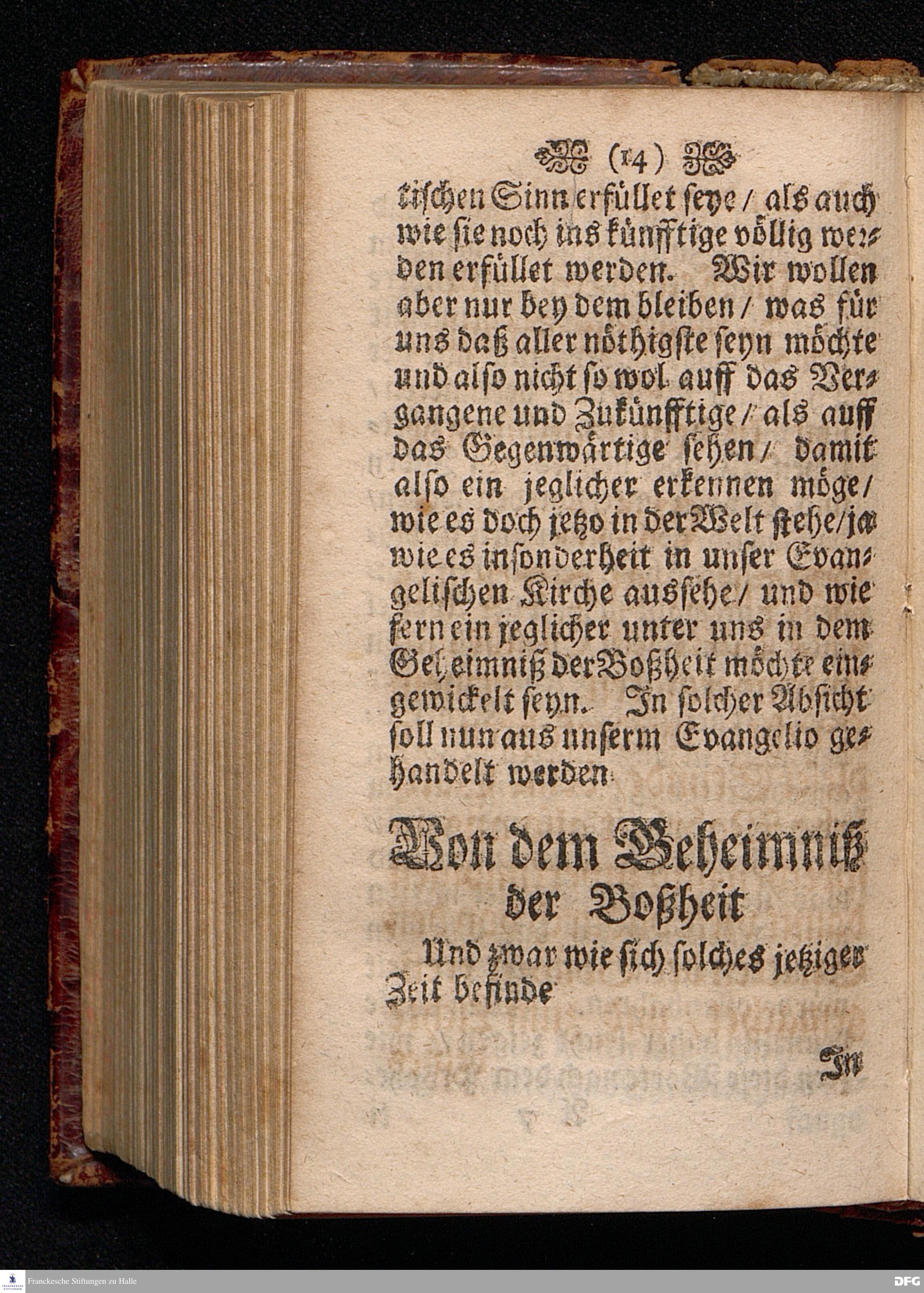 Das Geheimniß der Boßheit Am Fest der Erscheinung Anno 1699 in einer Predigt Uber das Evangelium Matth.II.v.1-12. In der St.Georgen Kirche zu Glaucha an Halle vorgestellet von August Hermann Francken S.S.Theol.P.Ord.& P.Glauch. HALLE / Druckts Christian Henckel / Univ.Buchdr.1701.