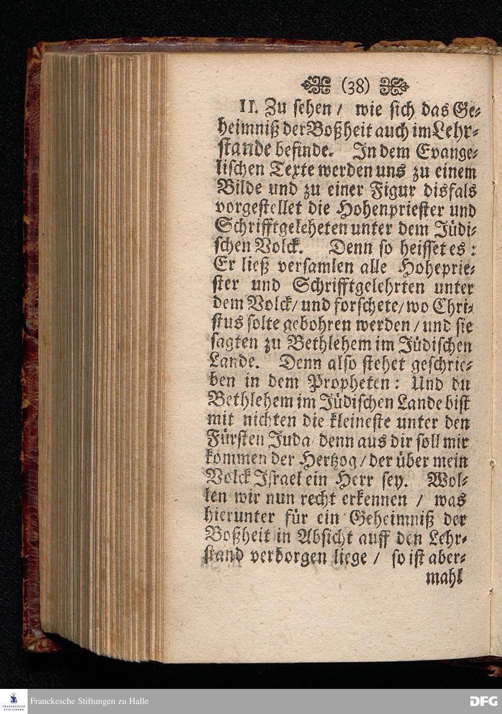 Das Geheimniß der Boßheit Am Fest der Erscheinung Anno 1699 in einer Predigt Uber das Evangelium Matth.II.v.1-12. In der St.Georgen Kirche zu Glaucha an Halle vorgestellet von August Hermann Francken S.S.Theol.P.Ord.& P.Glauch. HALLE / Druckts Christian Henckel / Univ.Buchdr.1701.