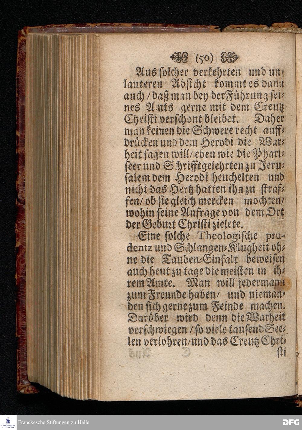 Das Geheimniß der Boßheit Am Fest der Erscheinung Anno 1699 in einer Predigt Uber das Evangelium Matth.II.v.1-12. In der St.Georgen Kirche zu Glaucha an Halle vorgestellet von August Hermann Francken S.S.Theol.P.Ord.& P.Glauch. HALLE / Druckts Christian Henckel / Univ.Buchdr.1701.