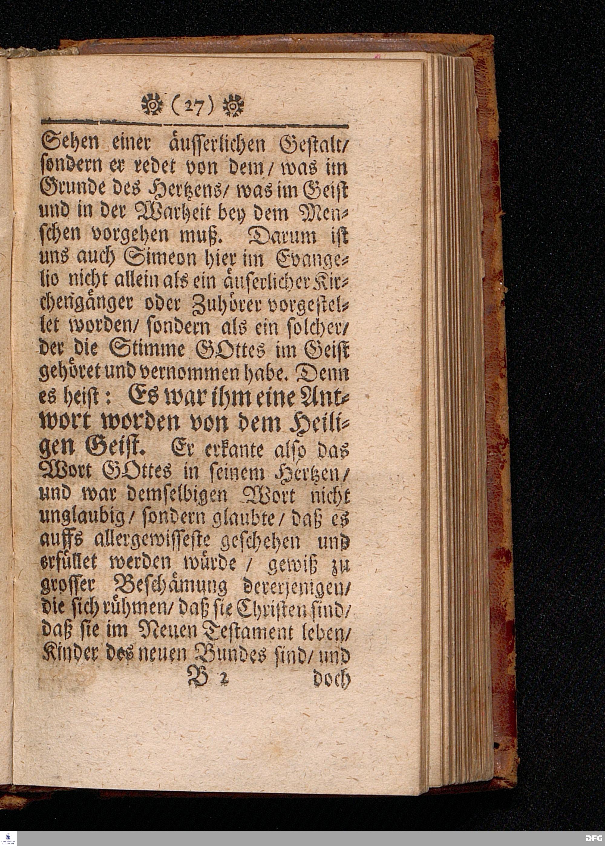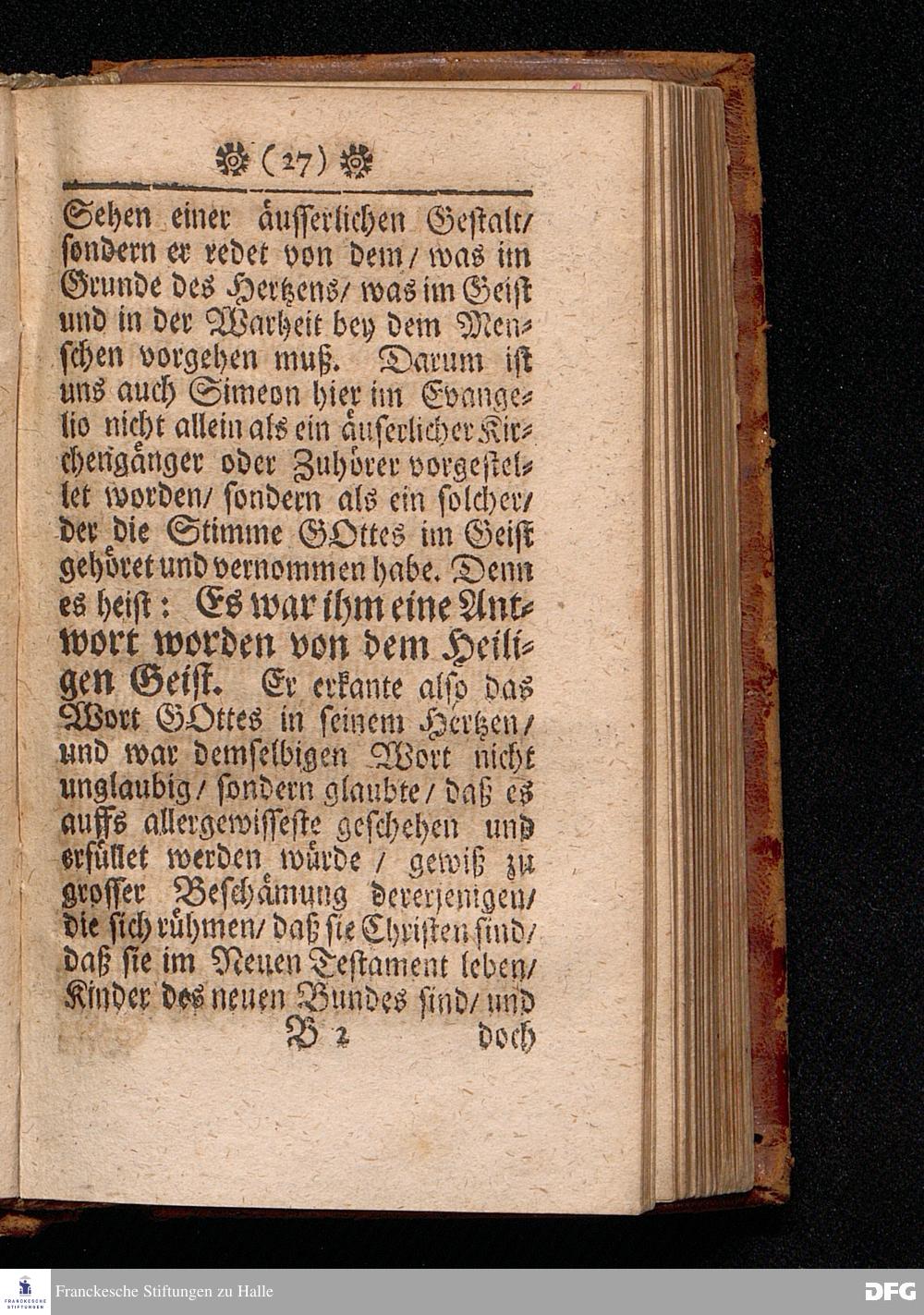 Die Hinfarth im Friede / Oder Der selige Tod / In einer Predigt Uber das Evangelium Luc.II, v.22-32. Am Fest=Tage der Reinigung Mariä / sonst Lichtmeß genannt / Anno 1701. In der St.Georgen=Kirche zu Glaucha an Halle vorgestellet von Aug.Hermann Francken / S.S.Theol.P.P.Ord.& Past. Glauch. HALLE / gedruckt bey Johann Grunern / 1702.