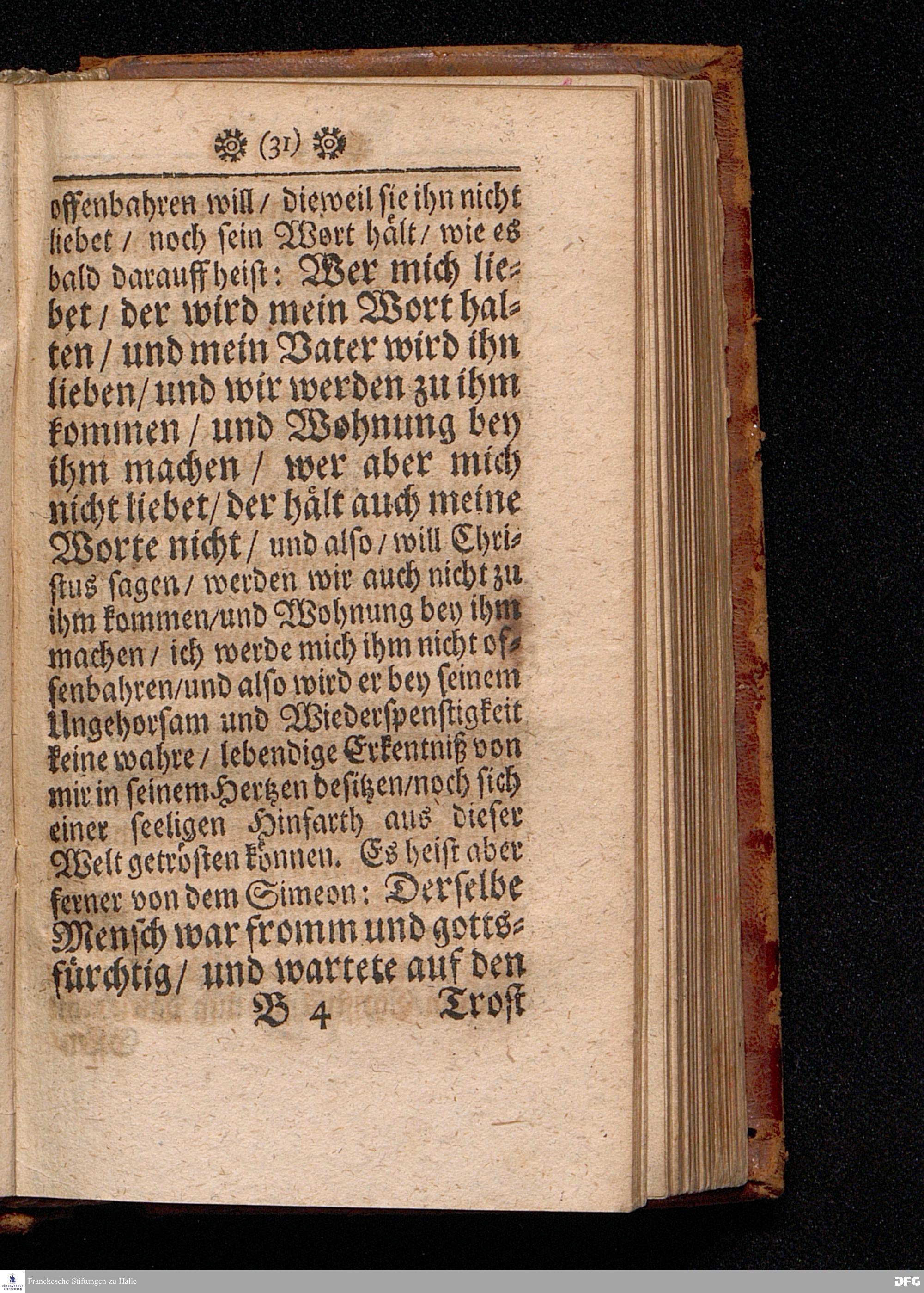 Die Hinfarth im Friede / Oder Der selige Tod / In einer Predigt Uber das Evangelium Luc.II, v.22-32. Am Fest=Tage der Reinigung Mariä / sonst Lichtmeß genannt / Anno 1701. In der St.Georgen=Kirche zu Glaucha an Halle vorgestellet von Aug.Hermann Francken / S.S.Theol.P.P.Ord.& Past. Glauch. HALLE / gedruckt bey Johann Grunern / 1702.