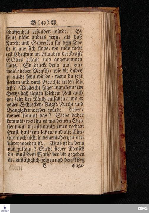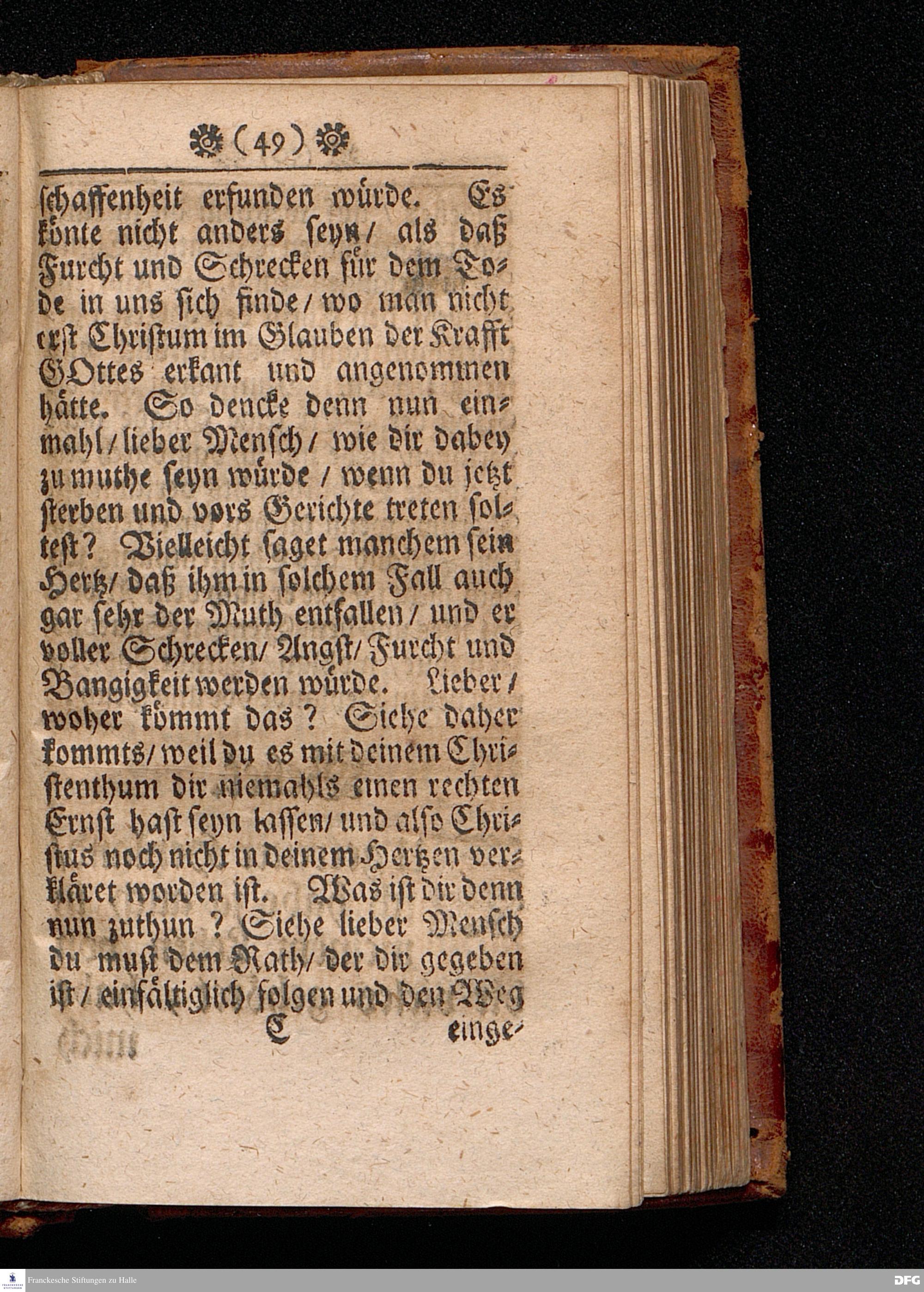 Die Hinfarth im Friede / Oder Der selige Tod / In einer Predigt Uber das Evangelium Luc.II, v.22-32. Am Fest=Tage der Reinigung Mariä / sonst Lichtmeß genannt / Anno 1701. In der St.Georgen=Kirche zu Glaucha an Halle vorgestellet von Aug.Hermann Francken / S.S.Theol.P.P.Ord.& Past. Glauch. HALLE / gedruckt bey Johann Grunern / 1702.