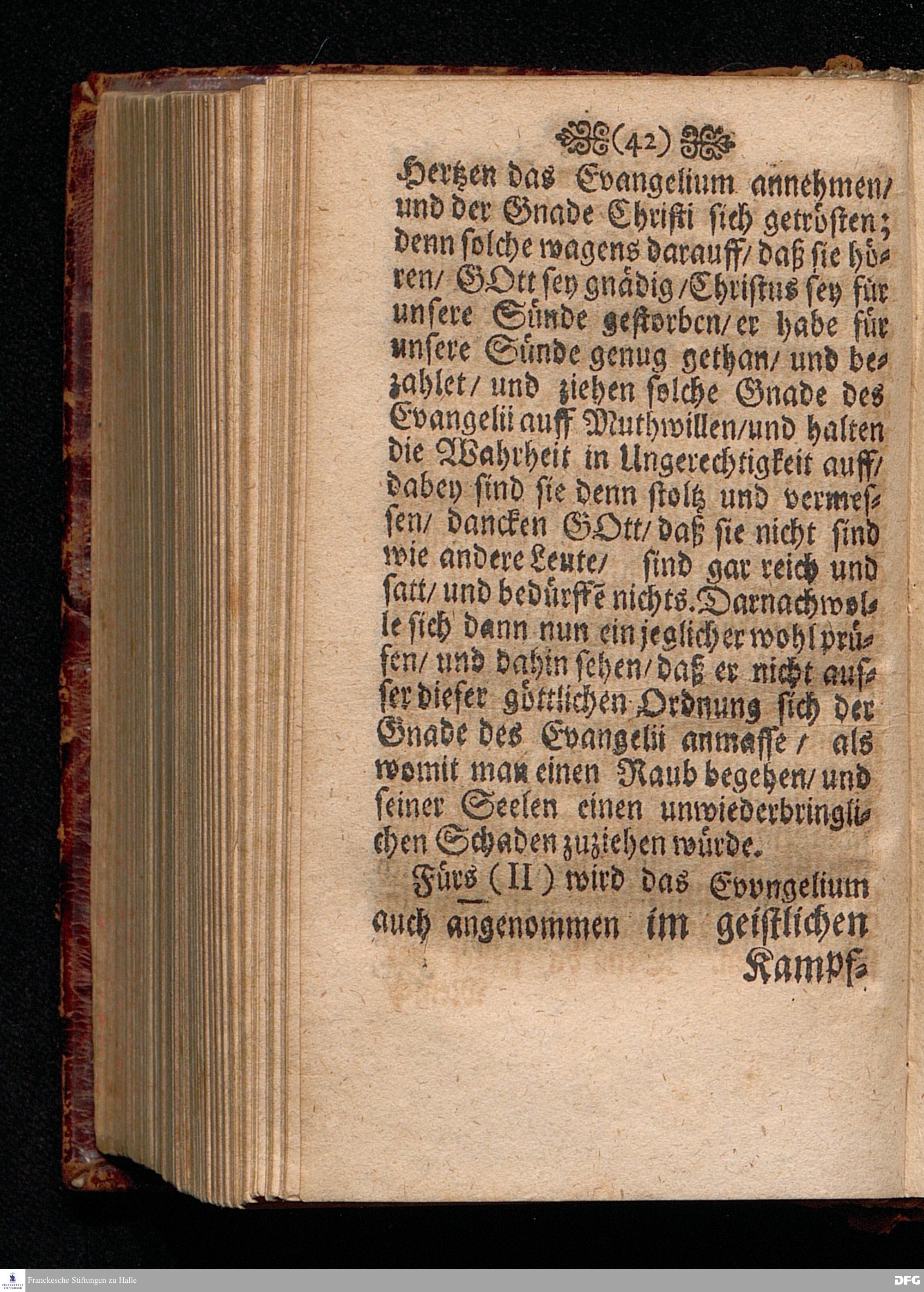 Die Annehmumg Des Evangelii In einer Predigt Uber das Evangelium Luc.I, vers.26=38. Am Festage der Verkündigung Mariä Anno 1699. In der St.Georgen=Kirche zu Glaucha an Halle vorgestellet von M.August Hermann Francken / SS.Theol.Prof.Ord & P.Glauch. HALLE Gedruckt bey Johann Grunerten / Univers.Buchdr. 1702.