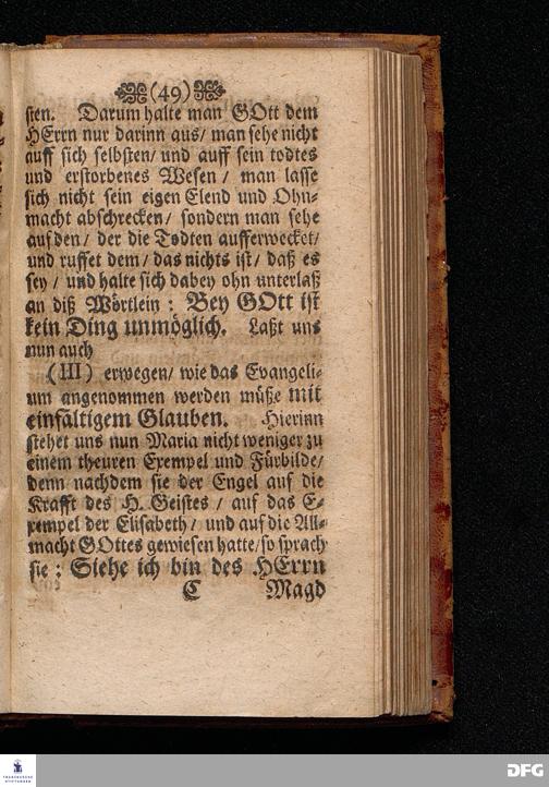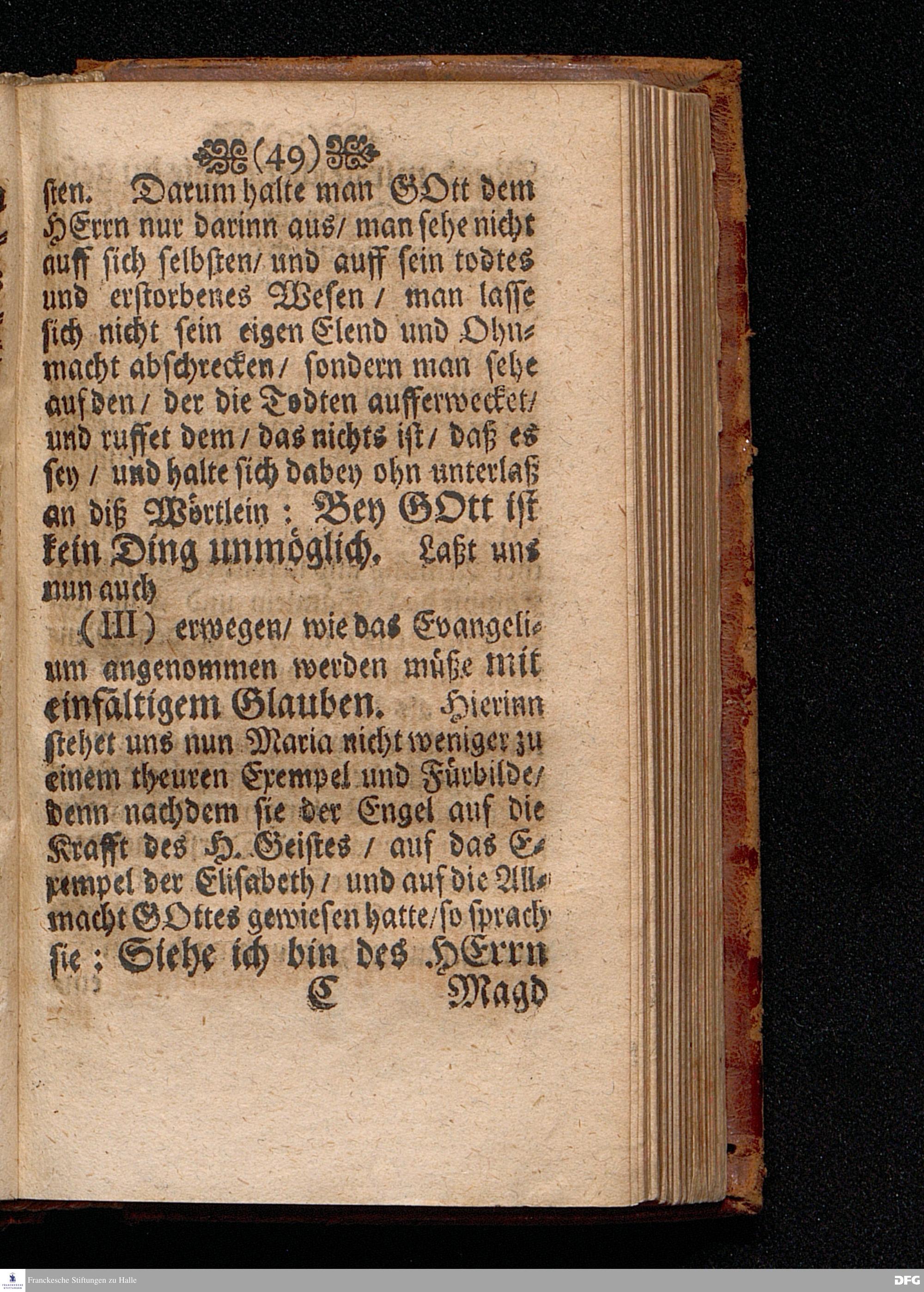 Die Annehmumg Des Evangelii In einer Predigt Uber das Evangelium Luc.I, vers.26=38. Am Festage der Verkündigung Mariä Anno 1699. In der St.Georgen=Kirche zu Glaucha an Halle vorgestellet von M.August Hermann Francken / SS.Theol.Prof.Ord & P.Glauch. HALLE Gedruckt bey Johann Grunerten / Univers.Buchdr. 1702.
