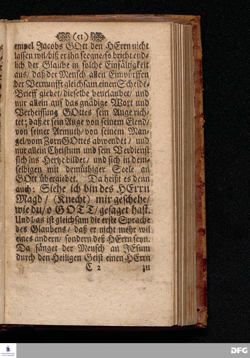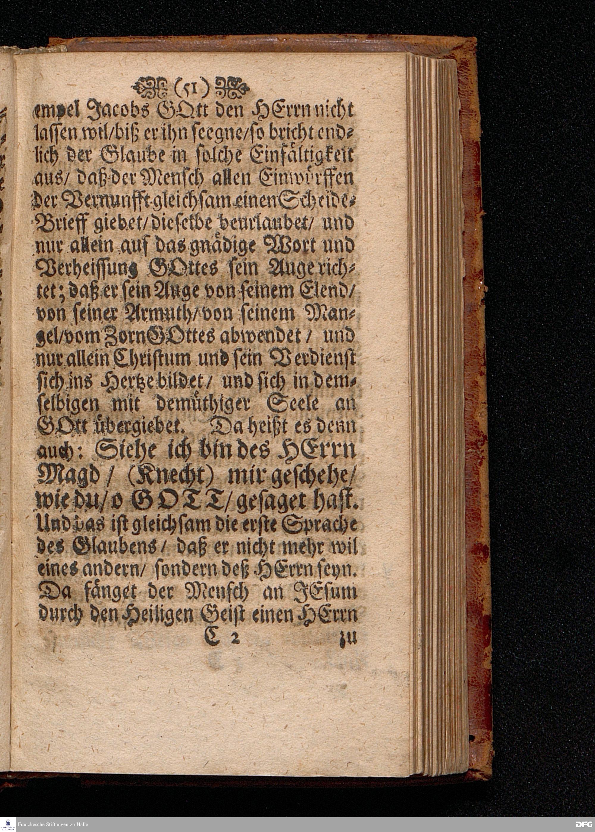 Die Annehmumg Des Evangelii In einer Predigt Uber das Evangelium Luc.I, vers.26=38. Am Festage der Verkündigung Mariä Anno 1699. In der St.Georgen=Kirche zu Glaucha an Halle vorgestellet von M.August Hermann Francken / SS.Theol.Prof.Ord & P.Glauch. HALLE Gedruckt bey Johann Grunerten / Univers.Buchdr. 1702.