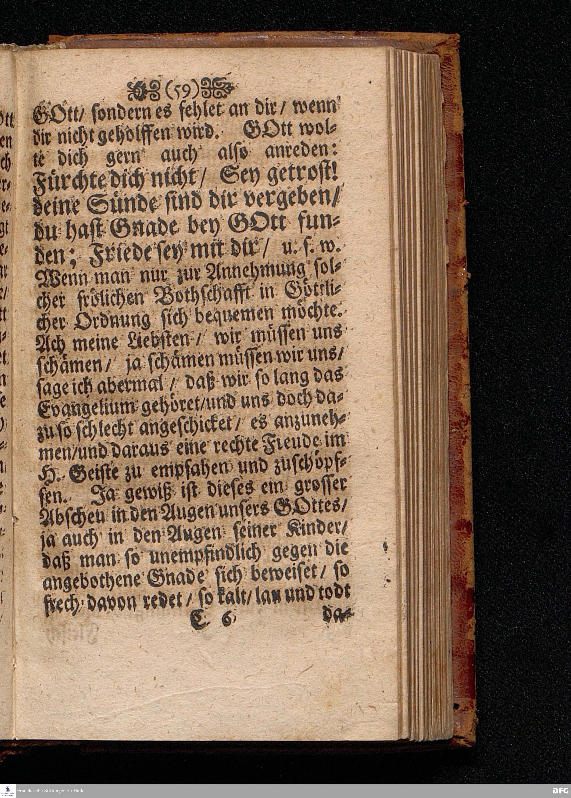 Die Annehmumg Des Evangelii In einer Predigt Uber das Evangelium Luc.I, vers.26=38. Am Festage der Verkündigung Mariä Anno 1699. In der St.Georgen=Kirche zu Glaucha an Halle vorgestellet von M.August Hermann Francken / SS.Theol.Prof.Ord & P.Glauch. HALLE Gedruckt bey Johann Grunerten / Univers.Buchdr. 1702.