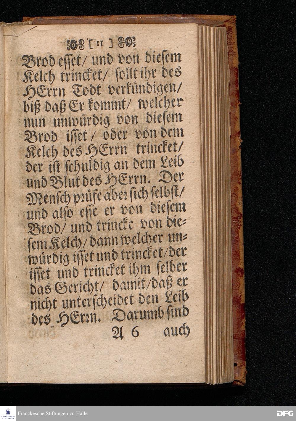 Der Unverantwortliche Mißbrauch des H.Abendmahls In der Evangel.Kirchen / In einer Predigt über I.Cor.XI, 23-33. Am Grünen Donners=Tage ANNO 1699. fürgestellet / und Zu wohlgemeinter Erweckung Der meisten Lehrer u. Zuhörer / die in solchem Mißbrauch so sicher dahin gehen / zum andern mal ans Licht gegeben von M.August Hermann Francken / SS.Theol.Gr.& OO.LL.PP.Ord.& P.Glauch. HALLE / Gedruckt bey Christian Henckeln / Univers.Buchdr. 1699.