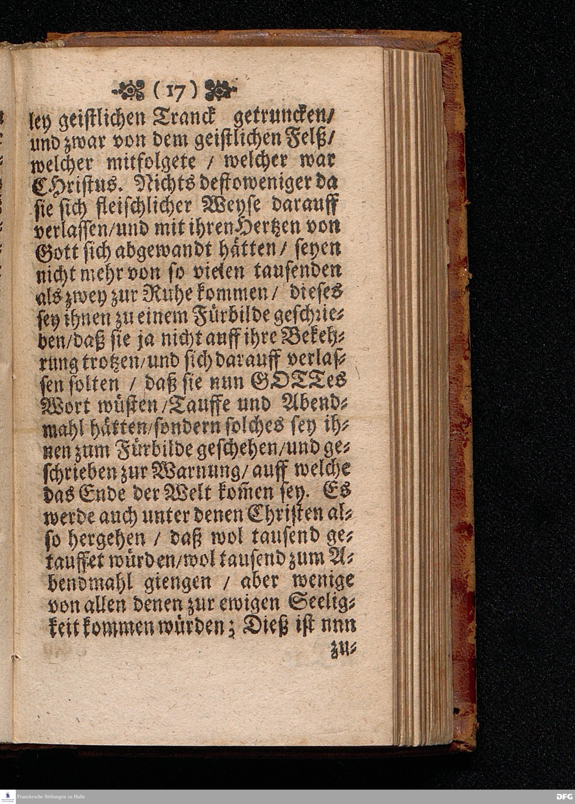 Der Unverantwortliche Mißbrauch des H.Abendmahls In der Evangel.Kirchen / In einer Predigt über I.Cor.XI, 23-33. Am Grünen Donners=Tage ANNO 1699. fürgestellet / und Zu wohlgemeinter Erweckung Der meisten Lehrer u. Zuhörer / die in solchem Mißbrauch so sicher dahin gehen / zum andern mal ans Licht gegeben von M.August Hermann Francken / SS.Theol.Gr.& OO.LL.PP.Ord.& P.Glauch. HALLE / Gedruckt bey Christian Henckeln / Univers.Buchdr. 1699.