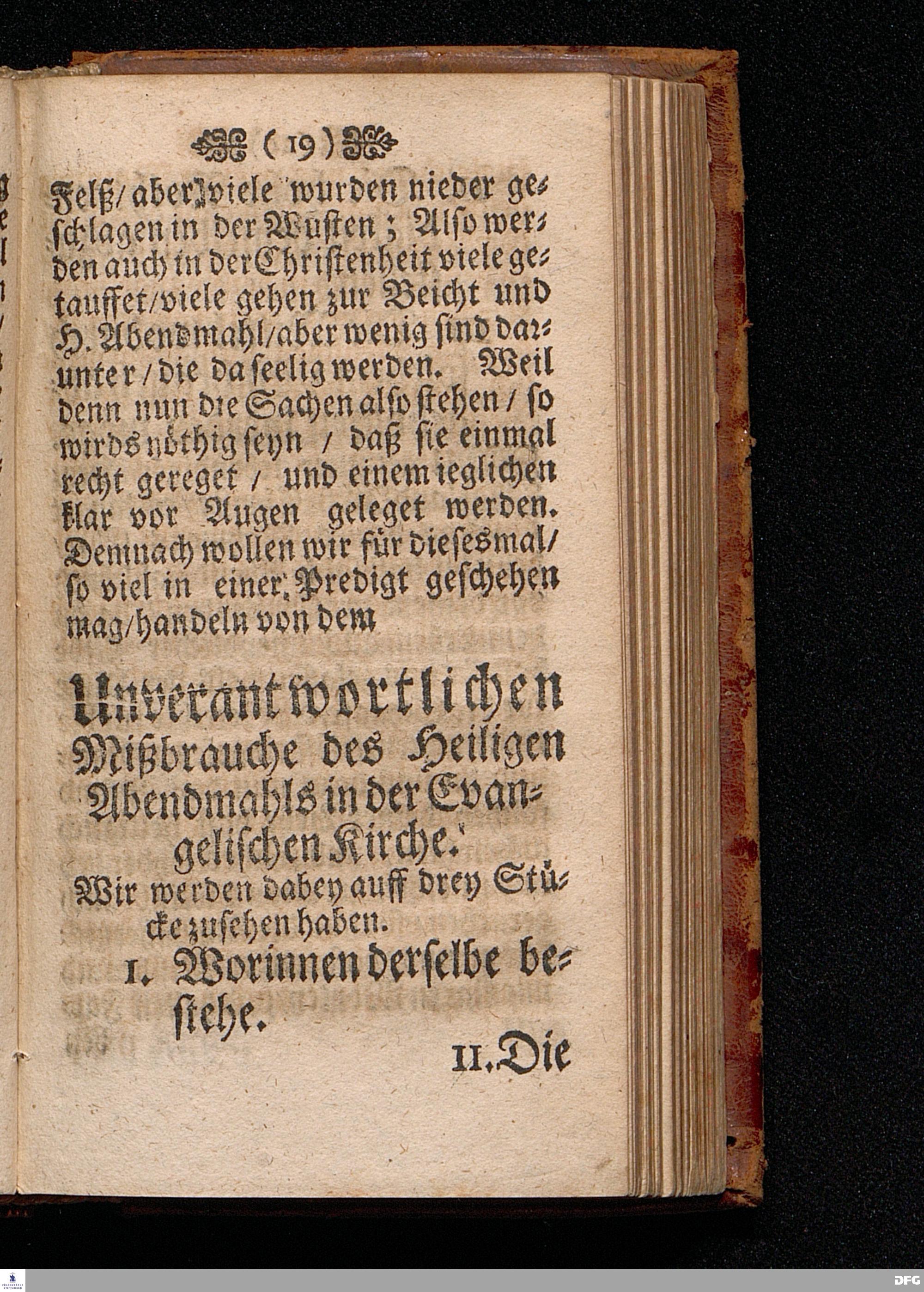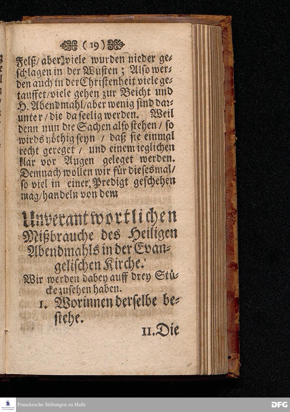 Der Unverantwortliche Mißbrauch des H.Abendmahls In der Evangel.Kirchen / In einer Predigt über I.Cor.XI, 23-33. Am Grünen Donners=Tage ANNO 1699. fürgestellet / und Zu wohlgemeinter Erweckung Der meisten Lehrer u. Zuhörer / die in solchem Mißbrauch so sicher dahin gehen / zum andern mal ans Licht gegeben von M.August Hermann Francken / SS.Theol.Gr.& OO.LL.PP.Ord.& P.Glauch. HALLE / Gedruckt bey Christian Henckeln / Univers.Buchdr. 1699.