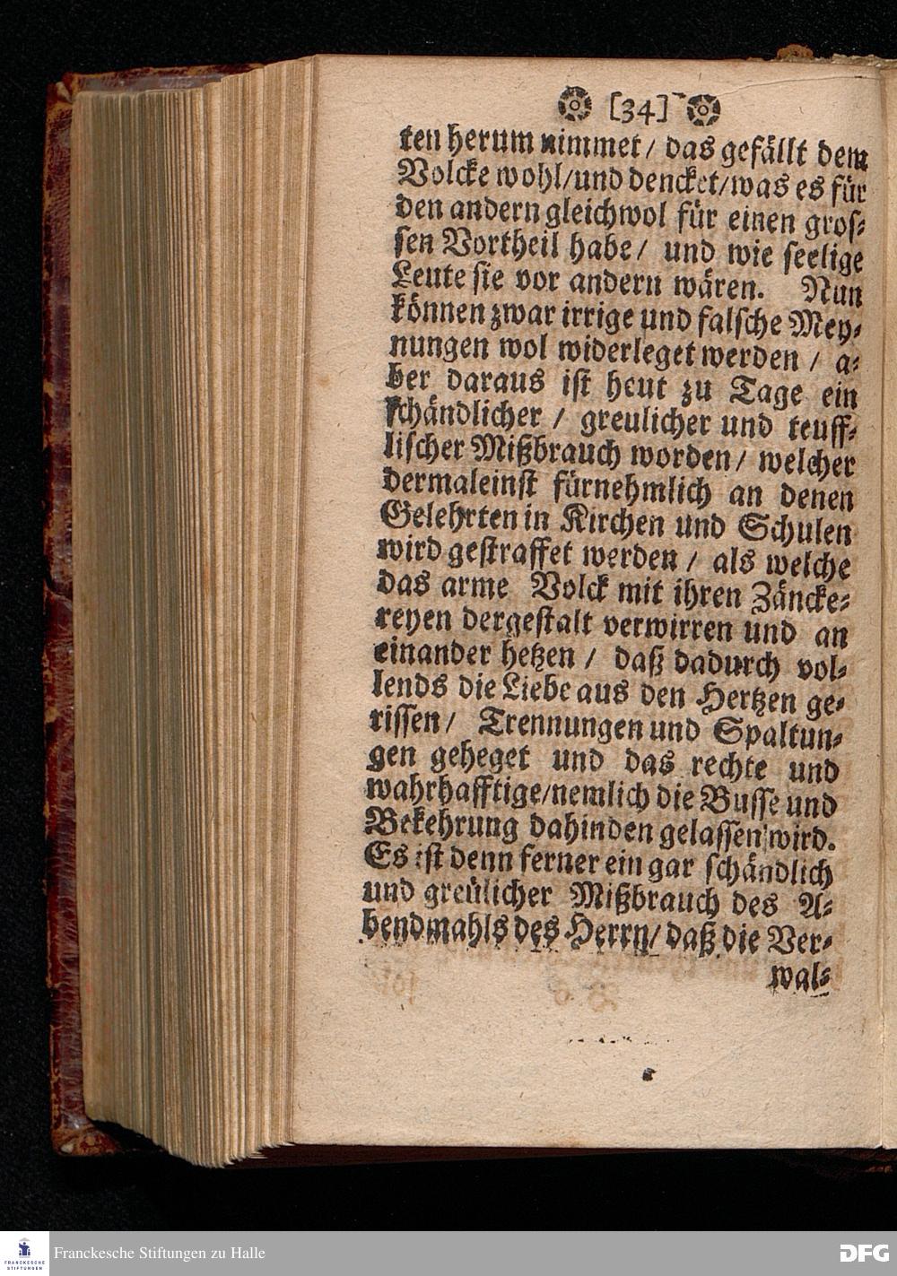 Der Unverantwortliche Mißbrauch des H.Abendmahls In der Evangel.Kirchen / In einer Predigt über I.Cor.XI, 23-33. Am Grünen Donners=Tage ANNO 1699. fürgestellet / und Zu wohlgemeinter Erweckung Der meisten Lehrer u. Zuhörer / die in solchem Mißbrauch so sicher dahin gehen / zum andern mal ans Licht gegeben von M.August Hermann Francken / SS.Theol.Gr.& OO.LL.PP.Ord.& P.Glauch. HALLE / Gedruckt bey Christian Henckeln / Univers.Buchdr. 1699.