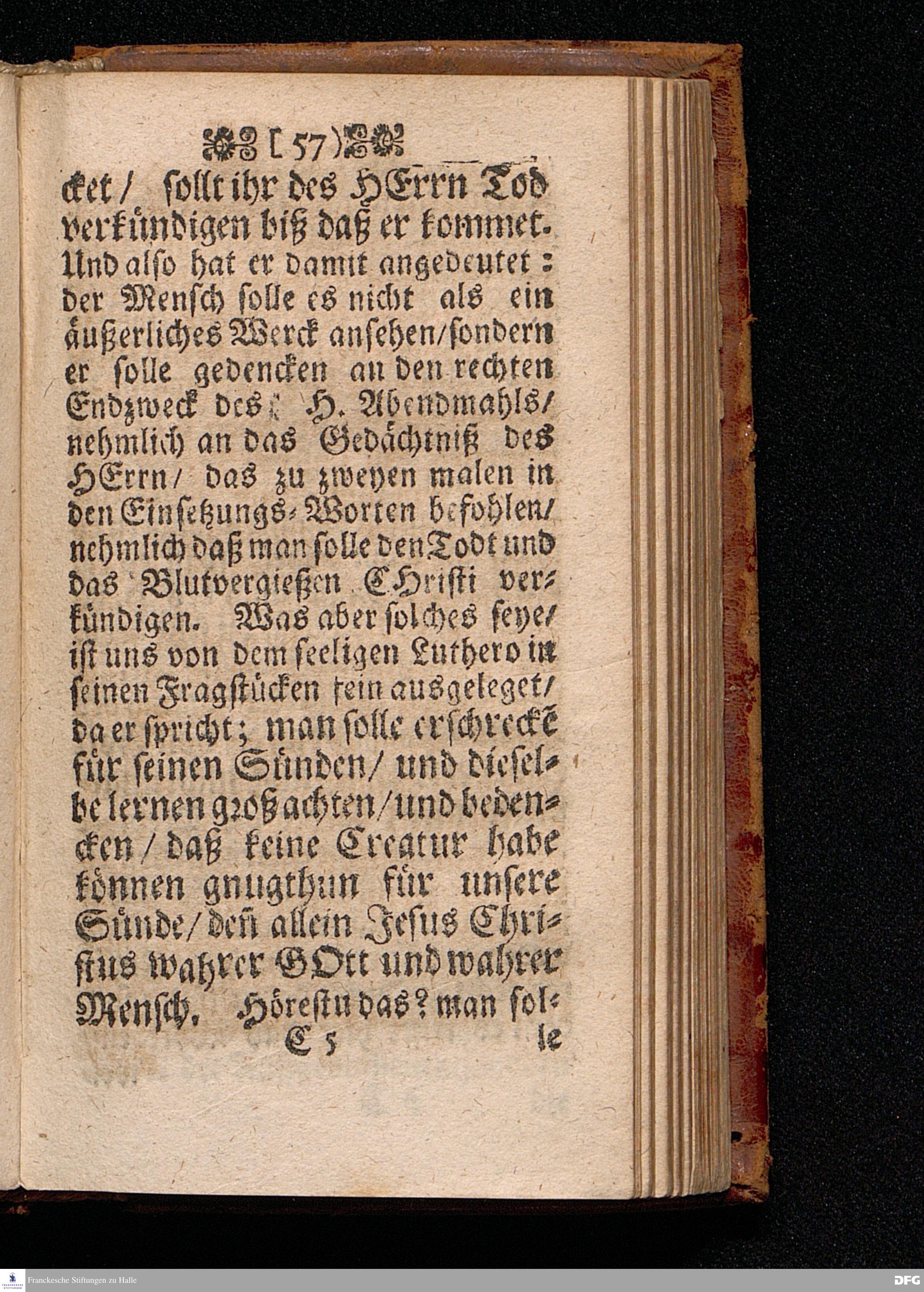 Der Unverantwortliche Mißbrauch des H.Abendmahls In der Evangel.Kirchen / In einer Predigt über I.Cor.XI, 23-33. Am Grünen Donners=Tage ANNO 1699. fürgestellet / und Zu wohlgemeinter Erweckung Der meisten Lehrer u. Zuhörer / die in solchem Mißbrauch so sicher dahin gehen / zum andern mal ans Licht gegeben von M.August Hermann Francken / SS.Theol.Gr.& OO.LL.PP.Ord.& P.Glauch. HALLE / Gedruckt bey Christian Henckeln / Univers.Buchdr. 1699.