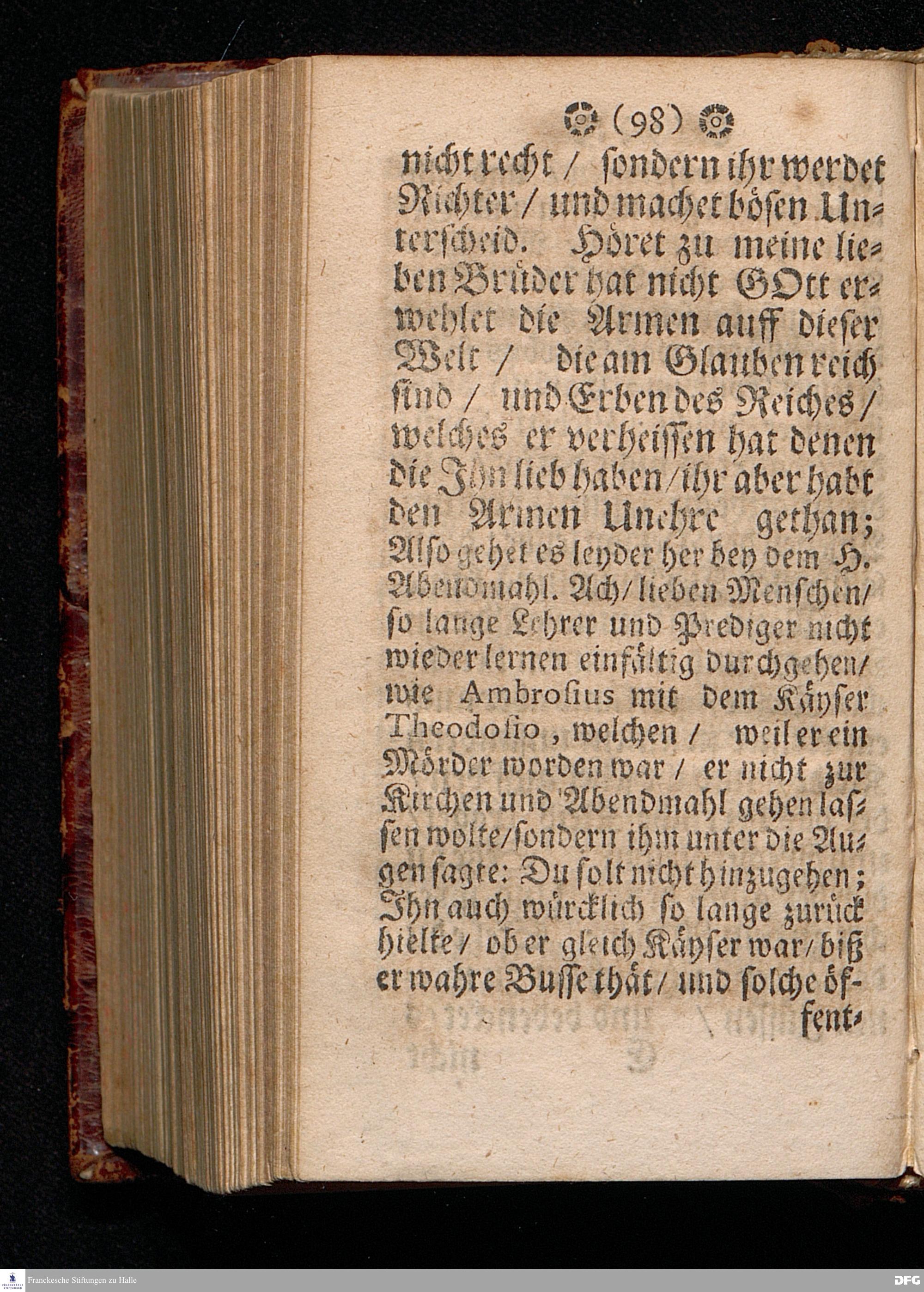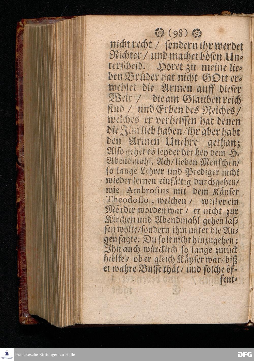 Der Unverantwortliche Mißbrauch des H.Abendmahls In der Evangel.Kirchen / In einer Predigt über I.Cor.XI, 23-33. Am Grünen Donners=Tage ANNO 1699. fürgestellet / und Zu wohlgemeinter Erweckung Der meisten Lehrer u. Zuhörer / die in solchem Mißbrauch so sicher dahin gehen / zum andern mal ans Licht gegeben von M.August Hermann Francken / SS.Theol.Gr.& OO.LL.PP.Ord.& P.Glauch. HALLE / Gedruckt bey Christian Henckeln / Univers.Buchdr. 1699.