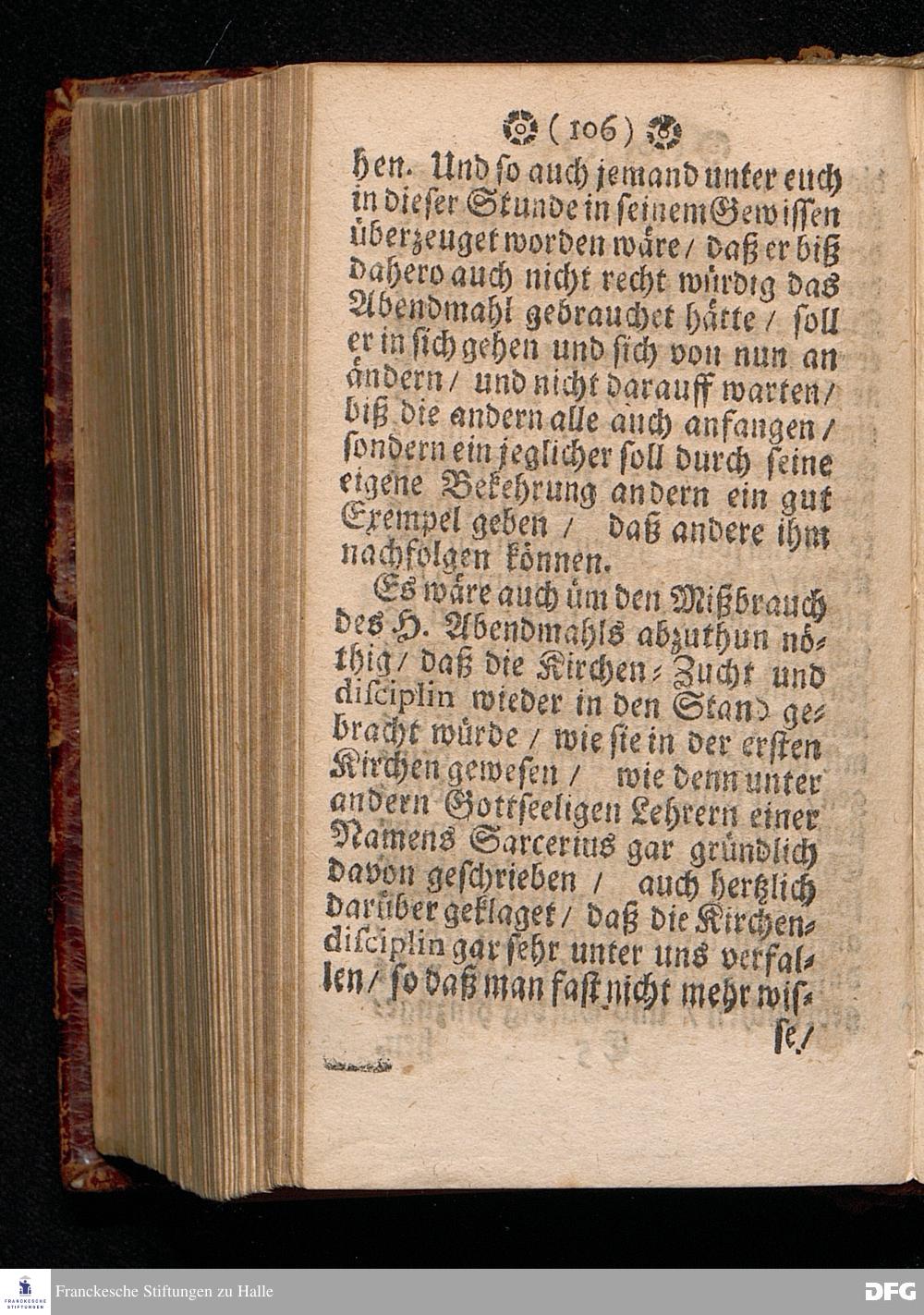 Der Unverantwortliche Mißbrauch des H.Abendmahls In der Evangel.Kirchen / In einer Predigt über I.Cor.XI, 23-33. Am Grünen Donners=Tage ANNO 1699. fürgestellet / und Zu wohlgemeinter Erweckung Der meisten Lehrer u. Zuhörer / die in solchem Mißbrauch so sicher dahin gehen / zum andern mal ans Licht gegeben von M.August Hermann Francken / SS.Theol.Gr.& OO.LL.PP.Ord.& P.Glauch. HALLE / Gedruckt bey Christian Henckeln / Univers.Buchdr. 1699.