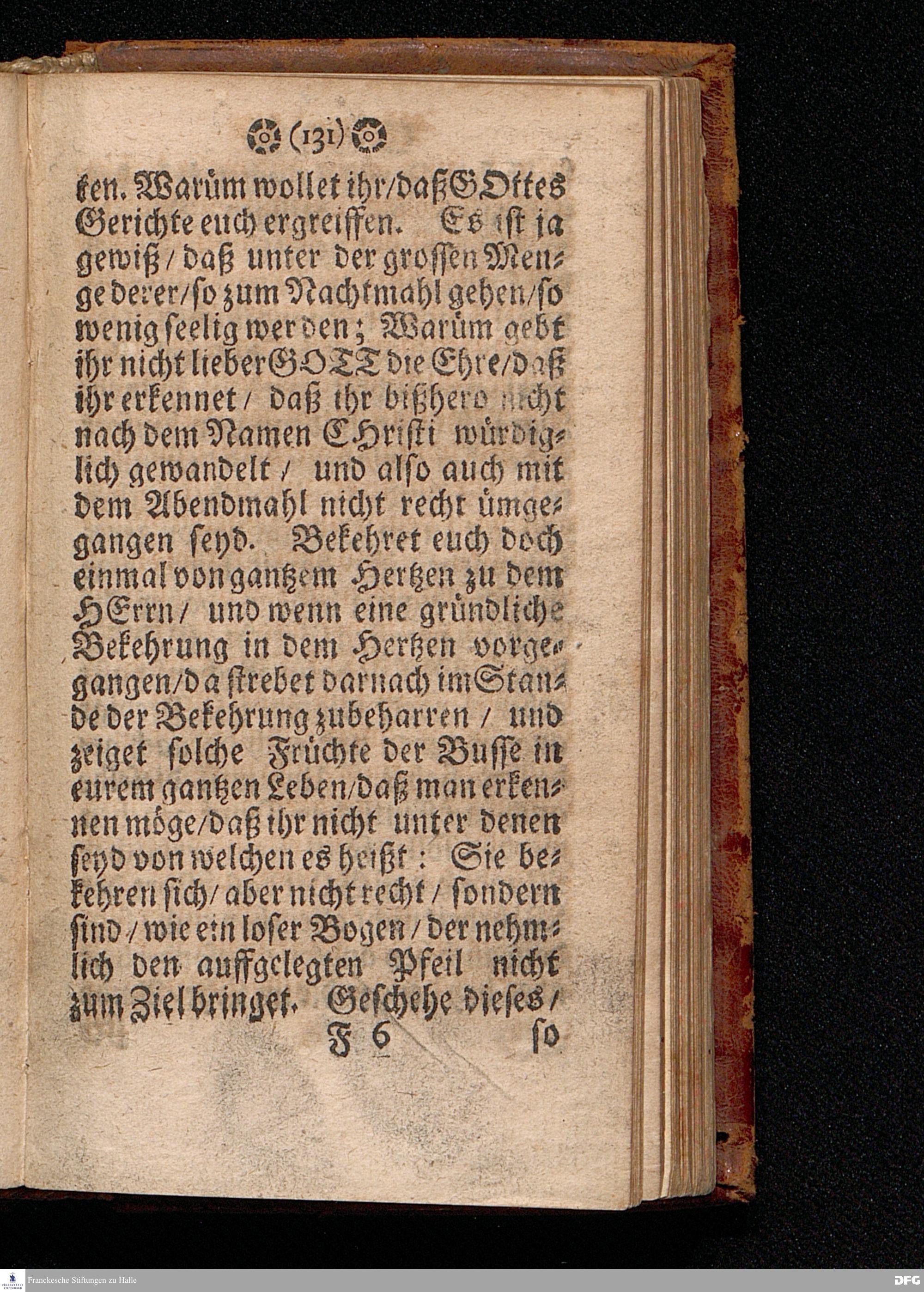 Der Unverantwortliche Mißbrauch des H.Abendmahls In der Evangel.Kirchen / In einer Predigt über I.Cor.XI, 23-33. Am Grünen Donners=Tage ANNO 1699. fürgestellet / und Zu wohlgemeinter Erweckung Der meisten Lehrer u. Zuhörer / die in solchem Mißbrauch so sicher dahin gehen / zum andern mal ans Licht gegeben von M.August Hermann Francken / SS.Theol.Gr.& OO.LL.PP.Ord.& P.Glauch. HALLE / Gedruckt bey Christian Henckeln / Univers.Buchdr. 1699.