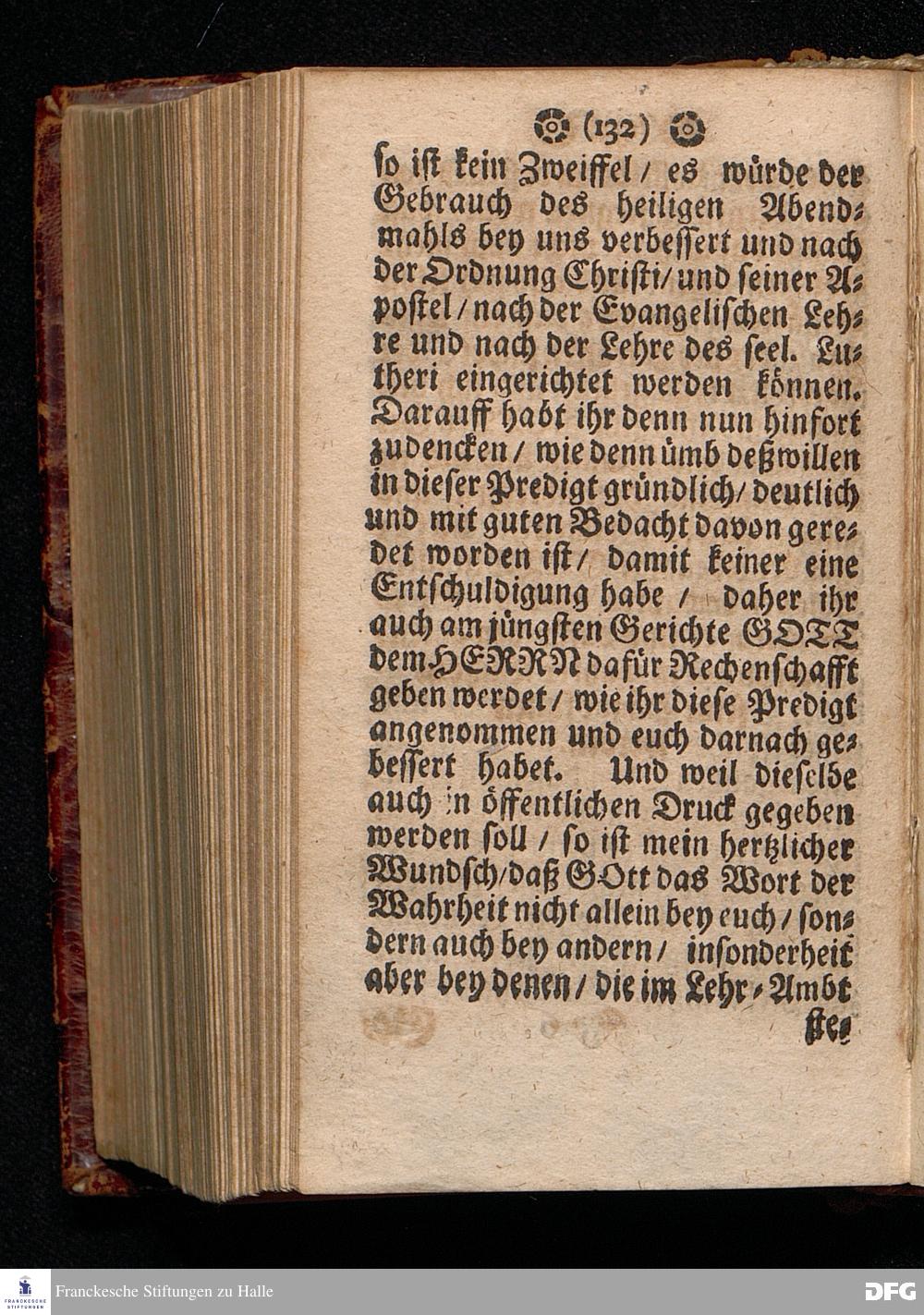 Der Unverantwortliche Mißbrauch des H.Abendmahls In der Evangel.Kirchen / In einer Predigt über I.Cor.XI, 23-33. Am Grünen Donners=Tage ANNO 1699. fürgestellet / und Zu wohlgemeinter Erweckung Der meisten Lehrer u. Zuhörer / die in solchem Mißbrauch so sicher dahin gehen / zum andern mal ans Licht gegeben von M.August Hermann Francken / SS.Theol.Gr.& OO.LL.PP.Ord.& P.Glauch. HALLE / Gedruckt bey Christian Henckeln / Univers.Buchdr. 1699.