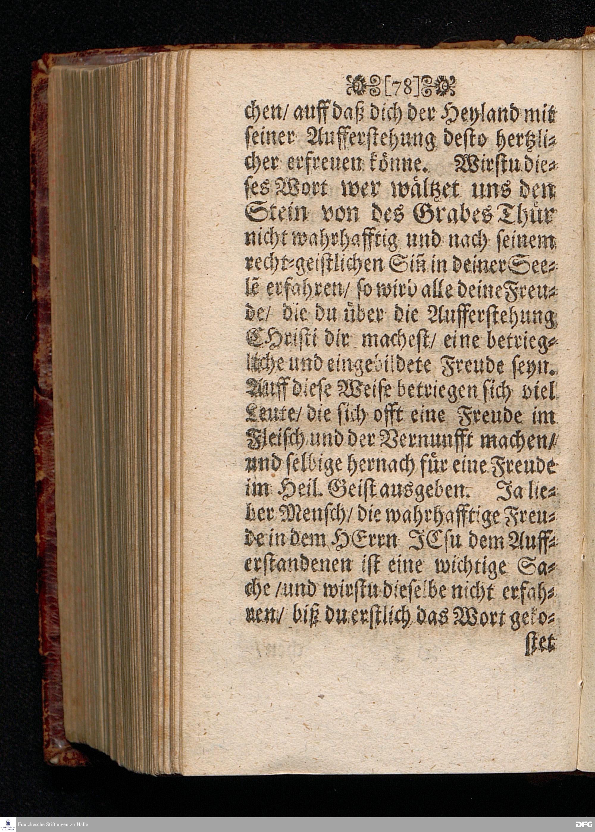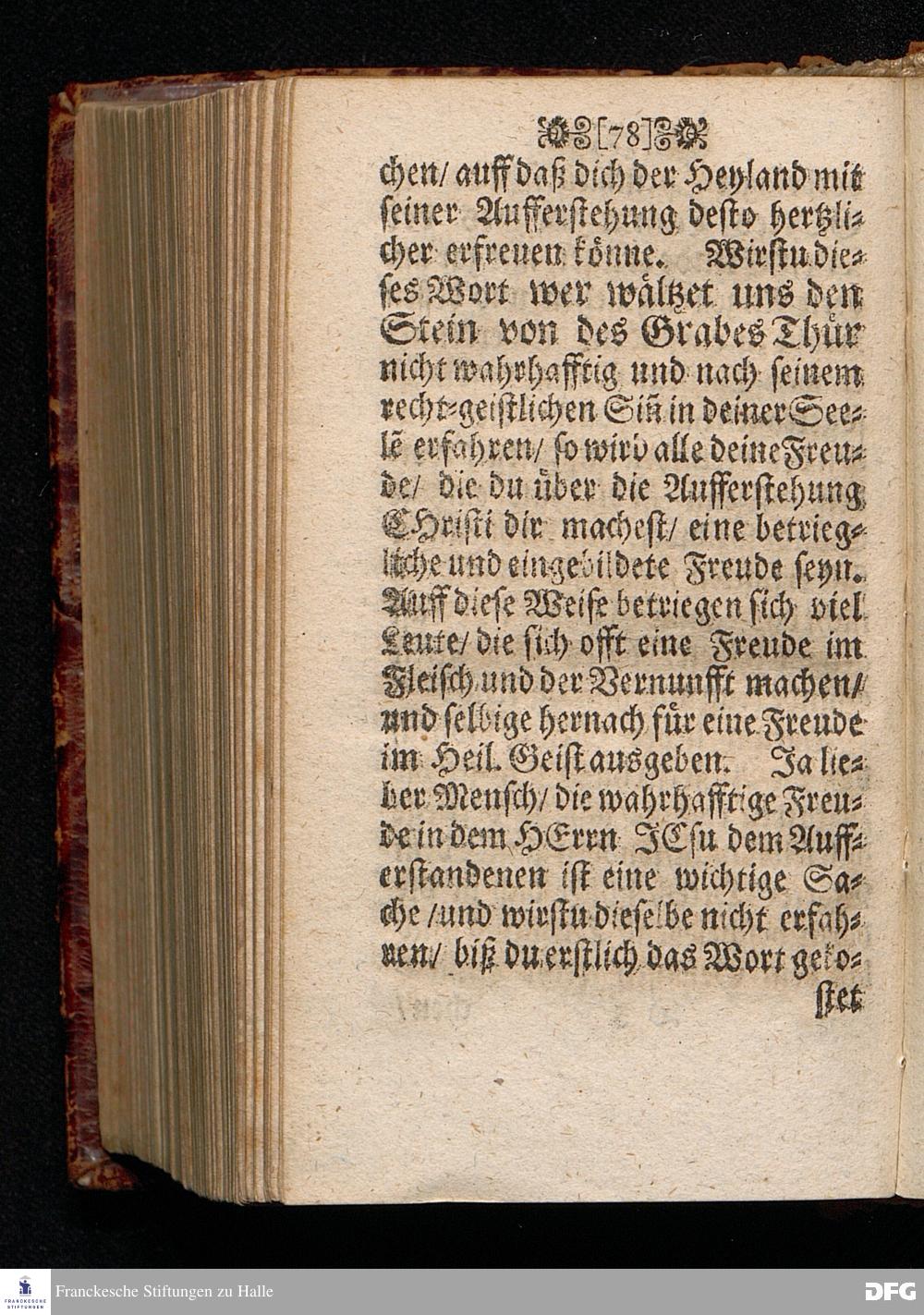 Das Lebendige Gedächtniß der Aufferstehung JESU CHristi; Am ersten Oster=Feyer=Tage über das Evangelium Marc. XVI. 1==8. In der St.Georgen=Kirche zu Glaucha an Halle MDCCI. vorgestellet / von August Hermann Francken / SS.Theol.PP.Ordin. & Past.Glauch. Halle / Druckts Joh.Grunert / U.B.