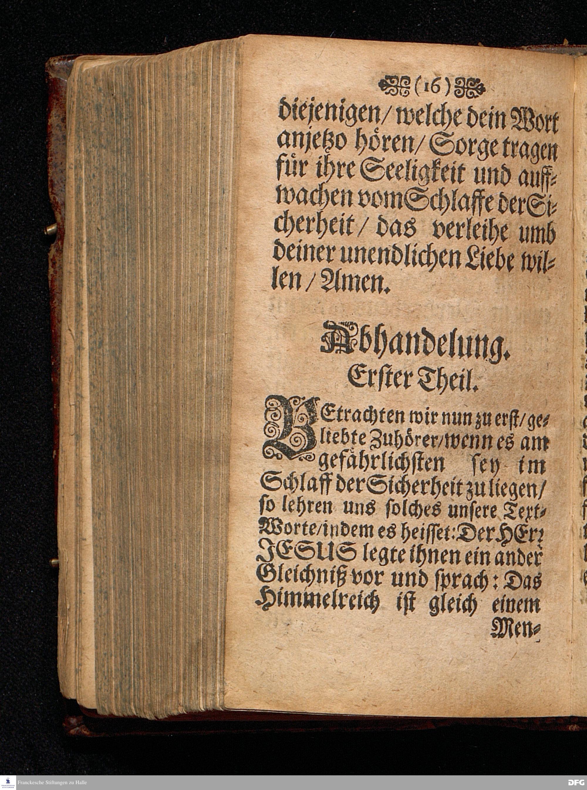 Die Gefährlichkeit des Schlaffs der Sicherheit / Am V.Sonntag nach Epiphan. ANNO 1698 In einer Predigt Aus dem Evangelio Matth.XIII. v.24--30. In der St.Georgen=Kirche zu Glaucha an Halle vorgestellet / von August Hermann Francken / S.S.Theol.Profess.P.Ordin.& Past.Glauch. HALLE / Druckts Christian Henckel / Univ.Buchdrucker.
