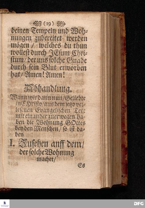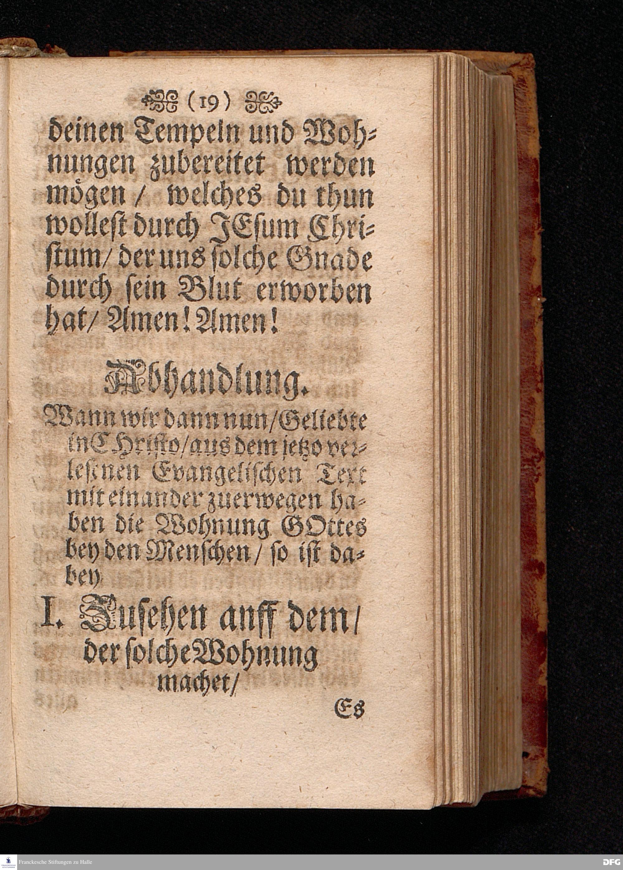 Die Wohnung GOttes bey den Menschen Am I.H.Pfingst=Tage Anno 1698 in einer Predigt Uber das Evangelium Joh.XIV. 23-31. In der St.Georgen Kirche zu Glaucha an Halle vorgestellet von August Hermann Francken S.S.Theol.P.Ord.& P.Glauch. HALLE / Druckts Christian Henckel / Univ.Buchdr. 1701.