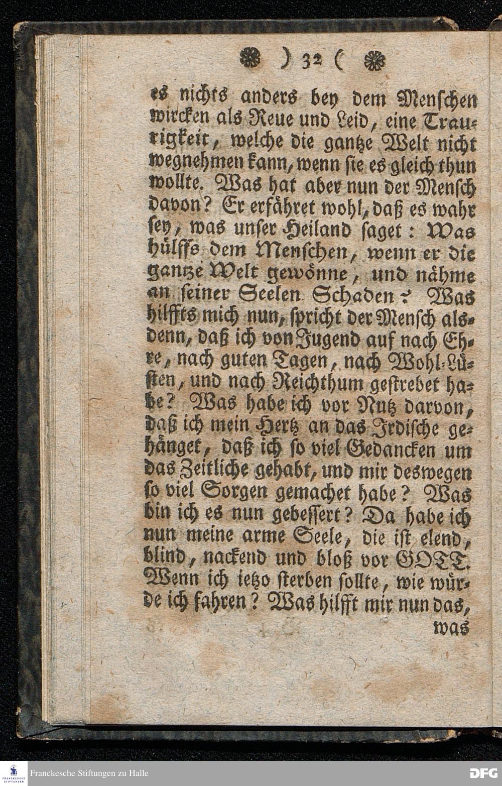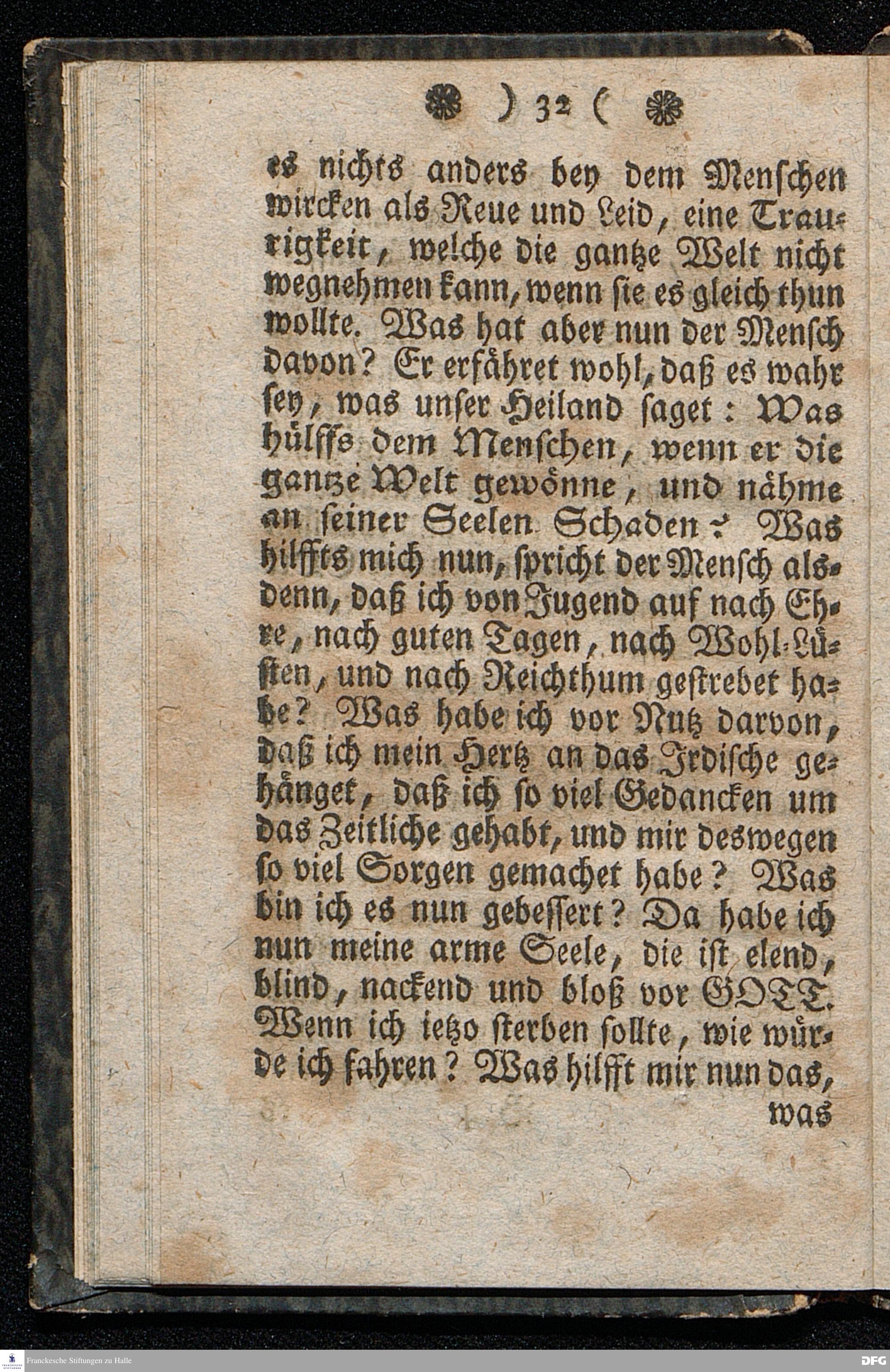 Der Hohe Werth der Seelen, In einer Buß=Predigt über Marc.8. v.36. Am 5.Junii 1709. In der St.Georgen=Kirche zu Glaucha an Halle vorgestellet, Von August Herm. Francken, SS.Theol.Prof.und Past.zu St.Ulrich, und des hiesigen Gymnasii Schol. HALLE, In Verlegung des Waysenhauses. 1753.