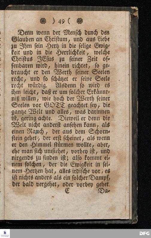 Der Hohe Werth der Seelen, In einer Buß=Predigt über Marc.8. v.36. Am 5.Junii 1709. In der St.Georgen=Kirche zu Glaucha an Halle vorgestellet, Von August Herm. Francken, SS.Theol.Prof.und Past.zu St.Ulrich, und des hiesigen Gymnasii Schol. HALLE, In Verlegung des Waysenhauses. 1753.