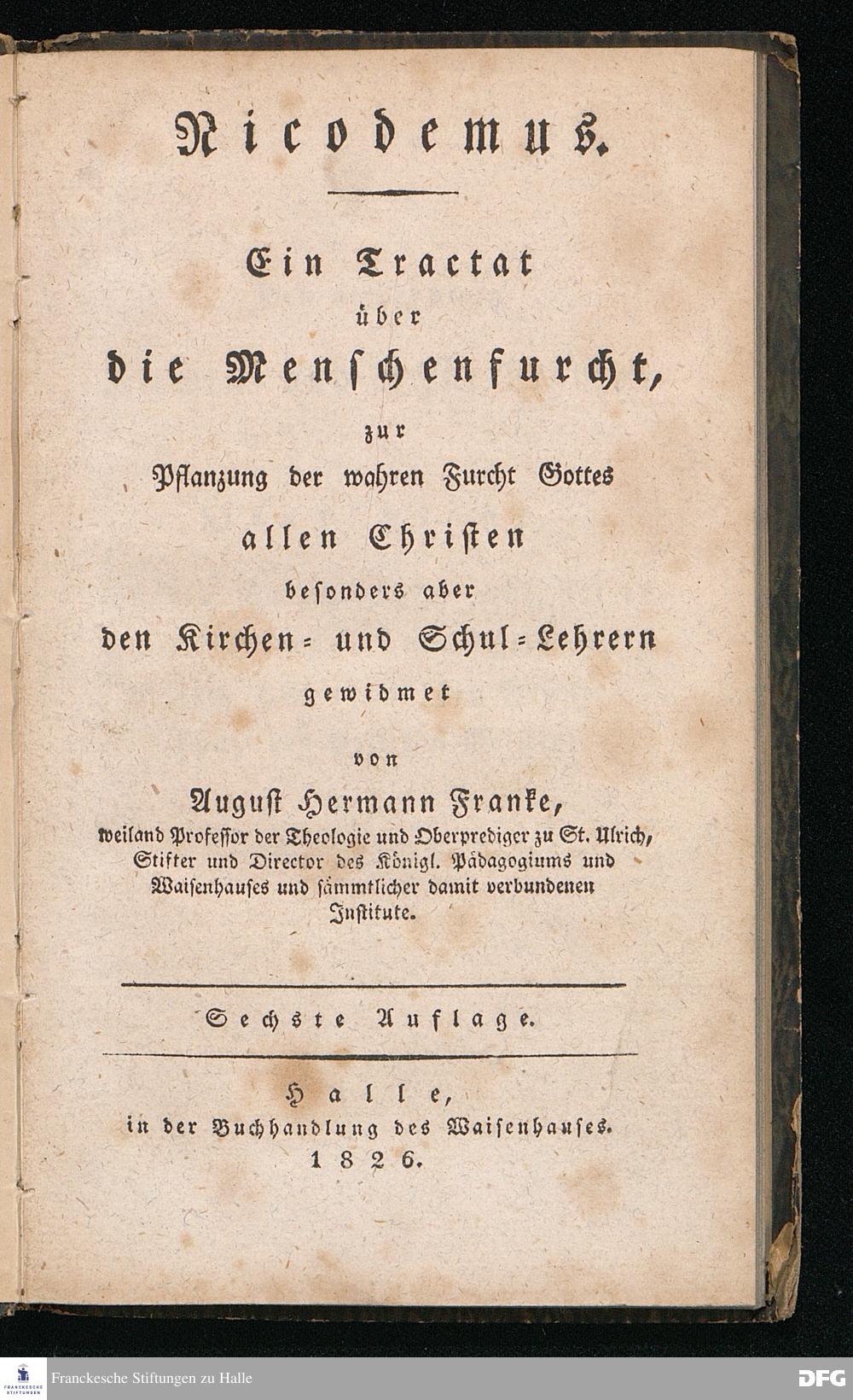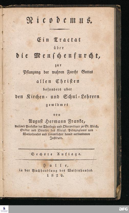 Nicodemus. Ein Tractat über die Menschenfurcht, zur Pflanzung der wahren Furcht Gottes allen Christen besonders aber den Kirchen= und Schul=Lehrern gewidmet von August Hermann Franke[!], weiland Professor der Theologie und Oberprediger zu St.Ulrich, Stifter und Director des Königl.Pädagogiums und Waisenhauses und sämmtlicher damit verbundenen Institute. Sechste Auflage. Halle, in der Buchhandlung des Waisenhauses. 1826.