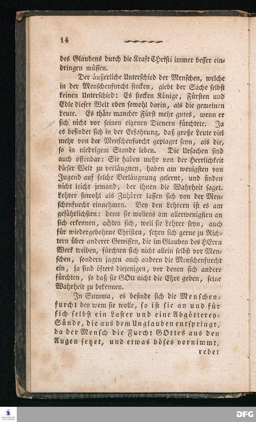 Nicodemus. Ein Tractat über die Menschenfurcht, zur Pflanzung der wahren Furcht Gottes allen Christen besonders aber den Kirchen= und Schul=Lehrern gewidmet von August Hermann Franke[!], weiland Professor der Theologie und Oberprediger zu St.Ulrich, Stifter und Director des Königl.Pädagogiums und Waisenhauses und sämmtlicher damit verbundenen Institute. Sechste Auflage. Halle, in der Buchhandlung des Waisenhauses. 1826.
