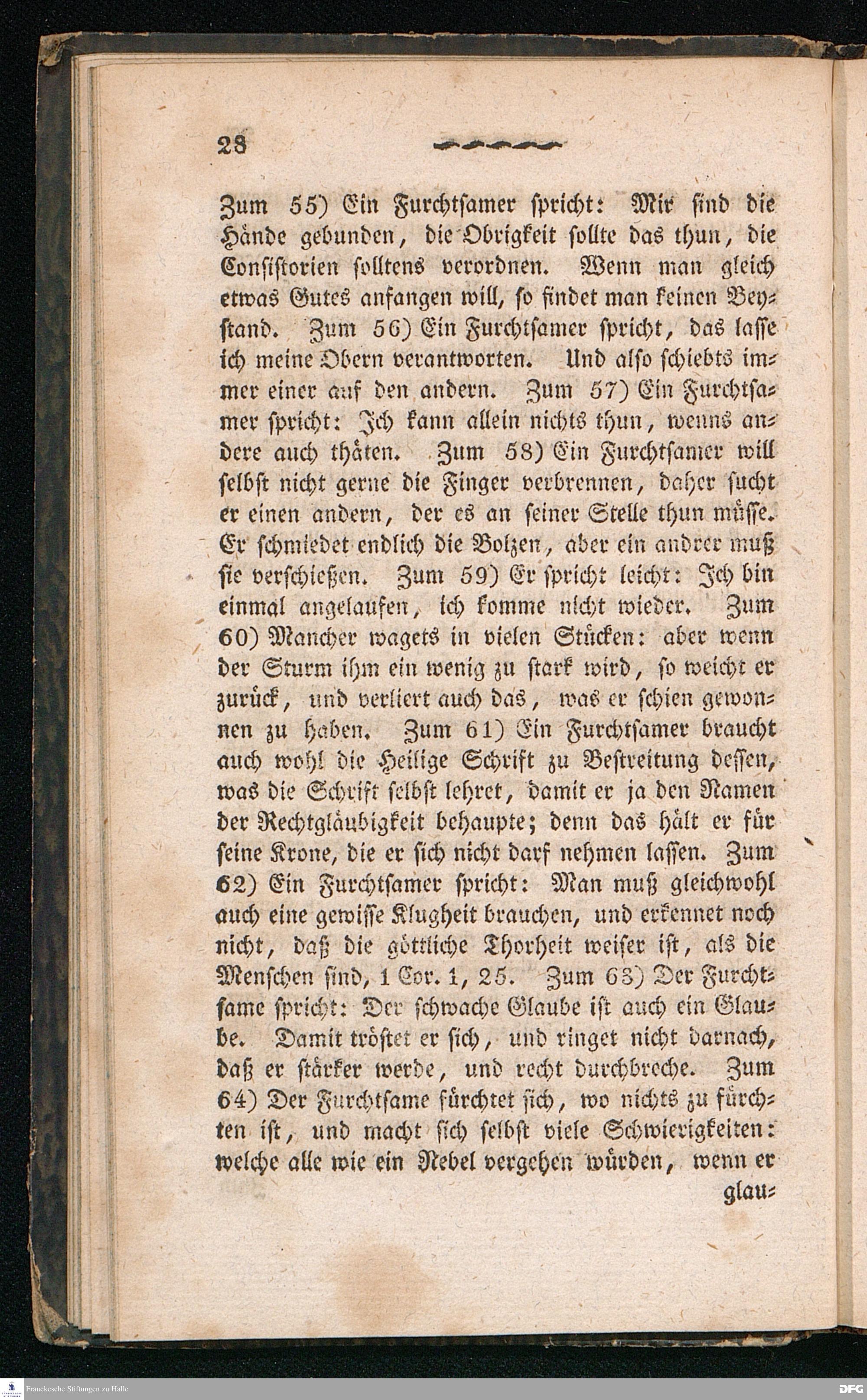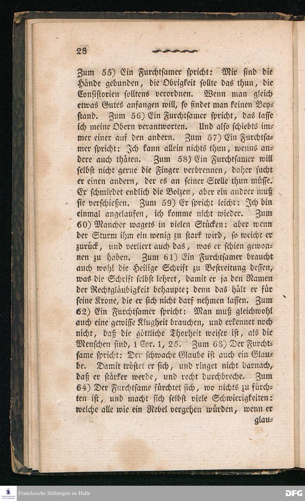 Nicodemus. Ein Tractat über die Menschenfurcht, zur Pflanzung der wahren Furcht Gottes allen Christen besonders aber den Kirchen= und Schul=Lehrern gewidmet von August Hermann Franke[!], weiland Professor der Theologie und Oberprediger zu St.Ulrich, Stifter und Director des Königl.Pädagogiums und Waisenhauses und sämmtlicher damit verbundenen Institute. Sechste Auflage. Halle, in der Buchhandlung des Waisenhauses. 1826.