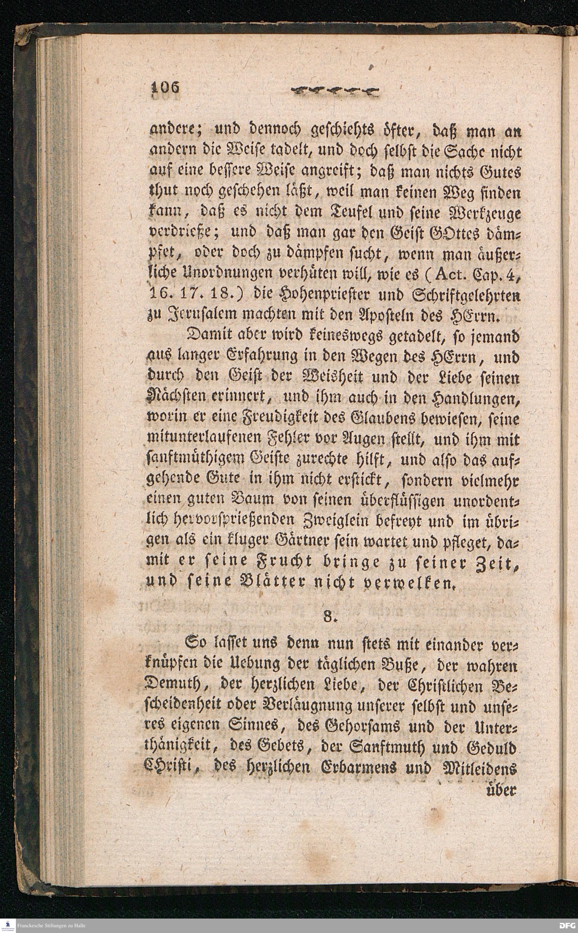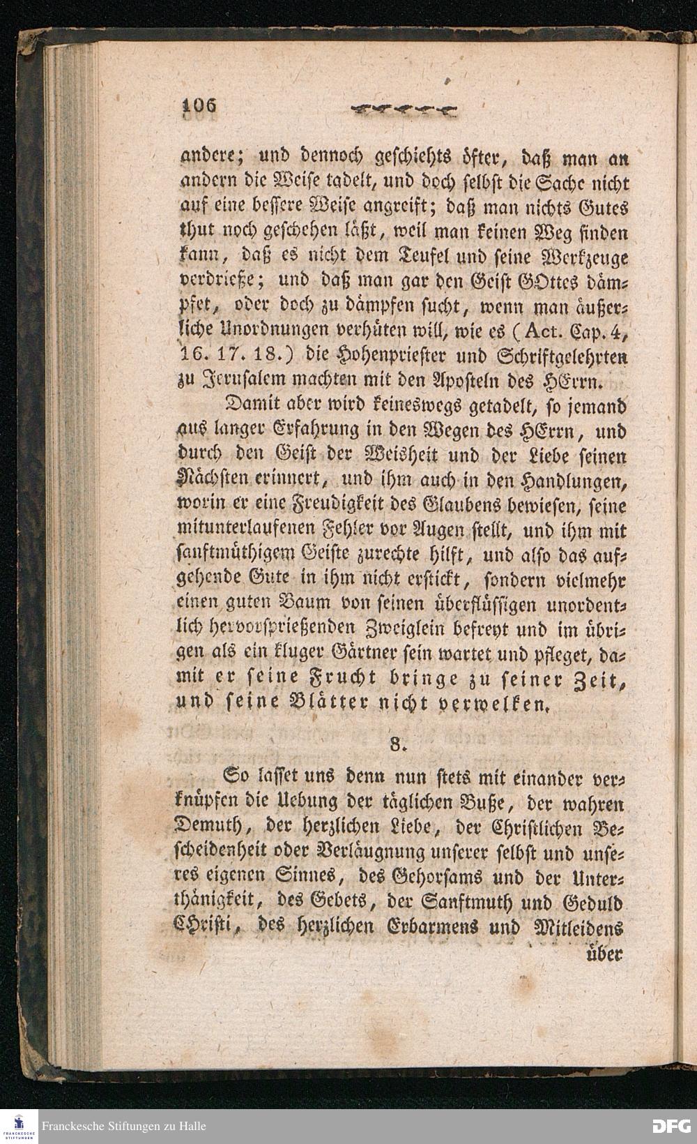 Nicodemus. Ein Tractat über die Menschenfurcht, zur Pflanzung der wahren Furcht Gottes allen Christen besonders aber den Kirchen= und Schul=Lehrern gewidmet von August Hermann Franke[!], weiland Professor der Theologie und Oberprediger zu St.Ulrich, Stifter und Director des Königl.Pädagogiums und Waisenhauses und sämmtlicher damit verbundenen Institute. Sechste Auflage. Halle, in der Buchhandlung des Waisenhauses. 1826.