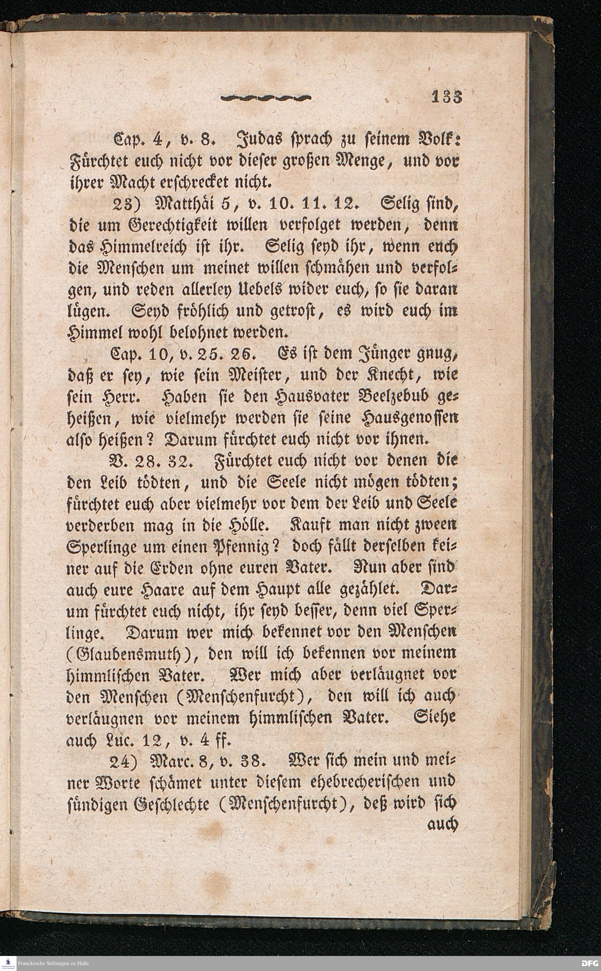 Nicodemus. Ein Tractat über die Menschenfurcht, zur Pflanzung der wahren Furcht Gottes allen Christen besonders aber den Kirchen= und Schul=Lehrern gewidmet von August Hermann Franke[!], weiland Professor der Theologie und Oberprediger zu St.Ulrich, Stifter und Director des Königl.Pädagogiums und Waisenhauses und sämmtlicher damit verbundenen Institute. Sechste Auflage. Halle, in der Buchhandlung des Waisenhauses. 1826.