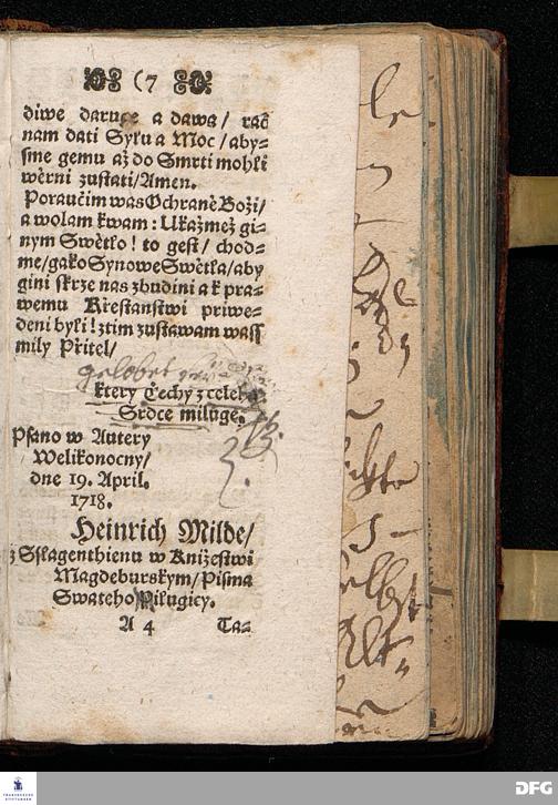 Swata a bezpecna Cesta Wiry Ewangelitskeho Krest`ana w Wyznawani nèkdy pokazana od Pana Augusta Herm. Franka / Pisma S. Ucitele w Halle/ a predniho Kazatel'e w Kostele S. Ulrika. nyhi pak Zlaski k Prawdè do Ceskeho Gazyku prekozena / a z Predmkuwu wydana od Heinricha Milde/ Pisma S. pikugicyho. Wytisstena w Halle/ a Stèpàna Orbana. Lèta Panè 1718