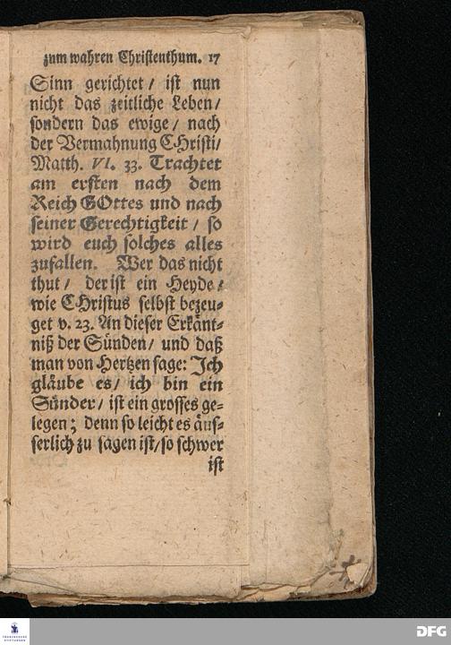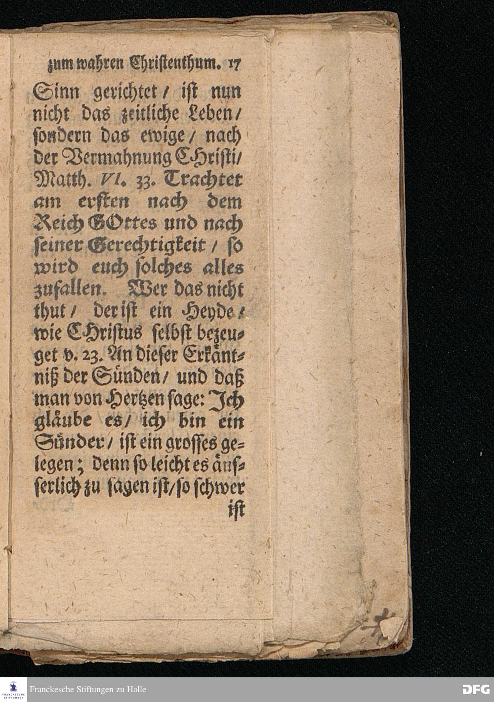 Schriftmäßige und gründliche Anleitung zum Wahren Christenthum / Vormals kürtzer abgefasset / Nun aber Zu mehrer Deutlichkeit und nützlicherm Gebrauch erweitert / Und aufs neue zum Druck gegeben von Aug.Herm.Francken / SS.Th.Prof.zu Halle und Past.zu Glaucha. HALLE / In Verlegung des Wäysen=Hauses. 1710.