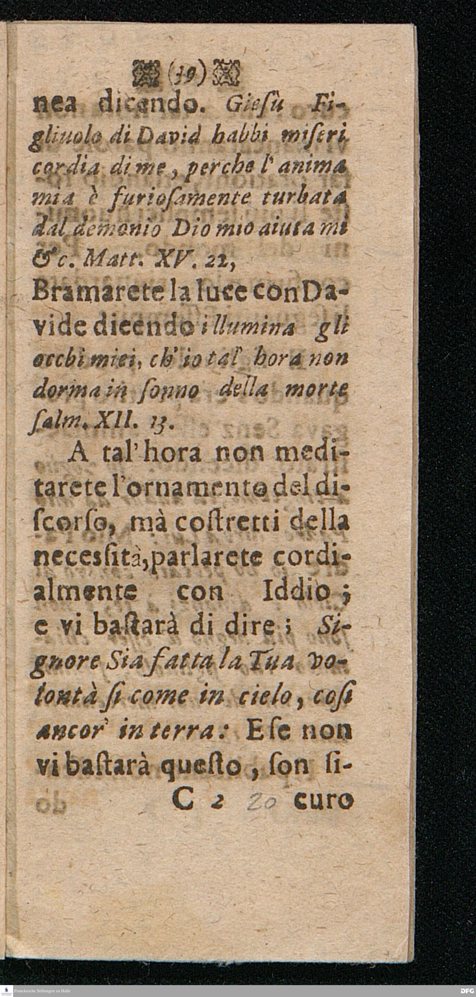 UTILISSIMA DOTTRINA Di bene e piace volmente pregare, Distinta in quattordici Paragrafi ripieni di belle Sentenze e Proverbi della Sacra Scrittura, dell'Evangelio, e de Salmi, Coll'aggiunta delle Preghiere Mattutine e Vepertine, Operate in lingua Todesca dal Molto Reverendo e Dottiss. Sign. Il Signore M. AVGVST. HERM. FRANCHIO, della Lingua Gre. & Orient. P.P. e Pastore in Glauchen vigilantissimo, hora transportata nella proprietà dell' Idioma Toscano all'uso di qualfisa cristiano amatore di Dio e della lingua Italiana dal M. Giorg. Franc. Ludovici, alle proprie Spese Halla