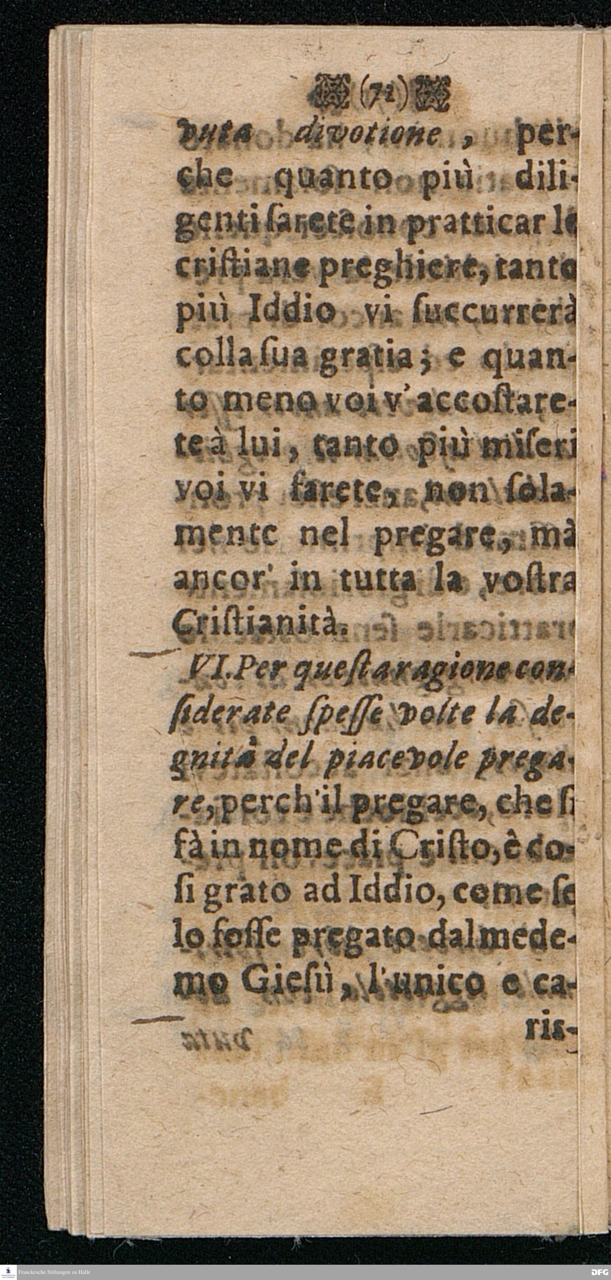 UTILISSIMA DOTTRINA Di bene e piace volmente pregare, Distinta in quattordici Paragrafi ripieni di belle Sentenze e Proverbi della Sacra Scrittura, dell'Evangelio, e de Salmi, Coll'aggiunta delle Preghiere Mattutine e Vepertine, Operate in lingua Todesca dal Molto Reverendo e Dottiss. Sign. Il Signore M. AVGVST. HERM. FRANCHIO, della Lingua Gre. & Orient. P.P. e Pastore in Glauchen vigilantissimo, hora transportata nella proprietà dell' Idioma Toscano all'uso di qualfisa cristiano amatore di Dio e della lingua Italiana dal M. Giorg. Franc. Ludovici, alle proprie Spese Halla