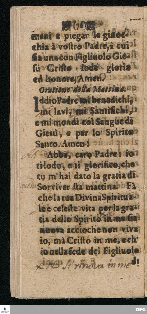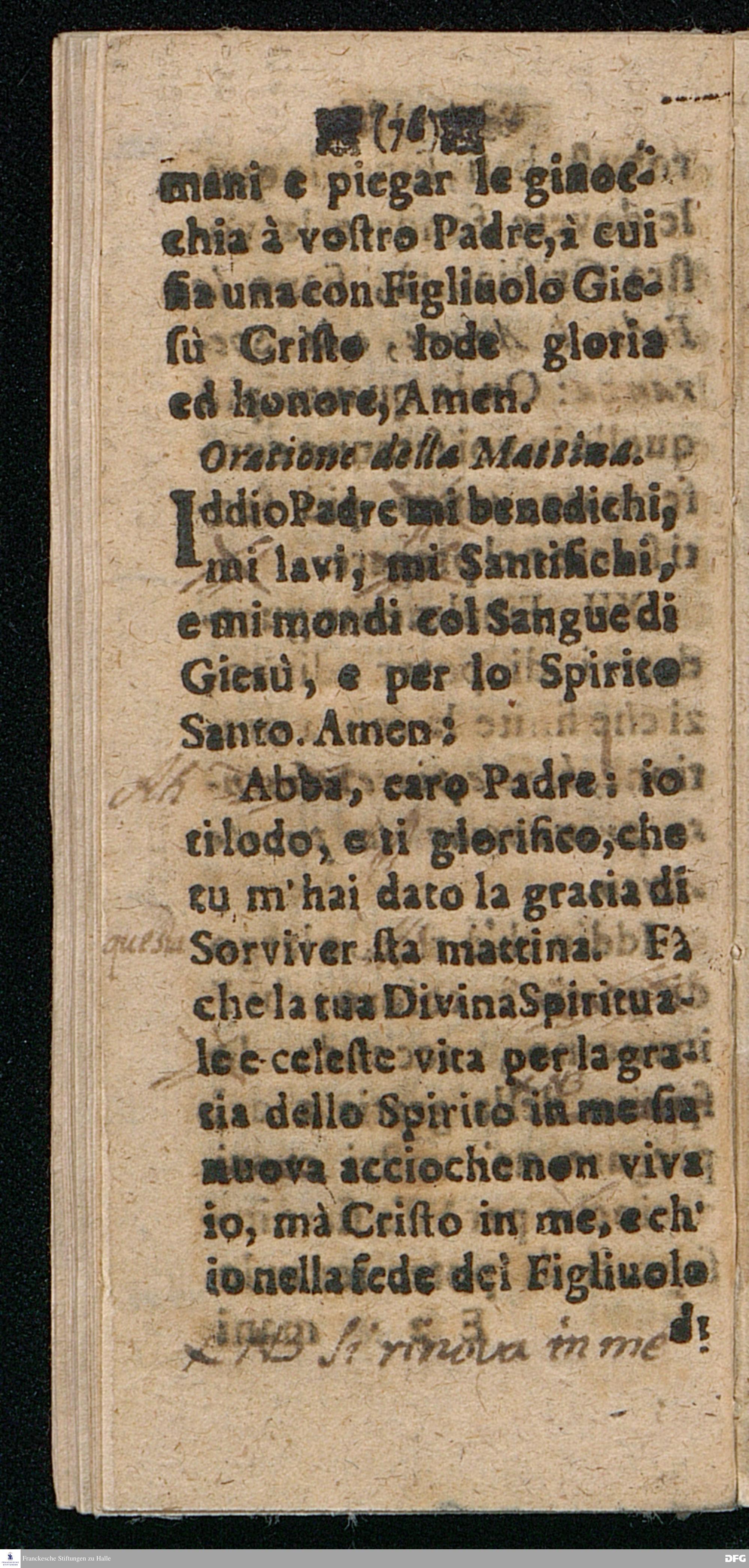 UTILISSIMA DOTTRINA Di bene e piace volmente pregare, Distinta in quattordici Paragrafi ripieni di belle Sentenze e Proverbi della Sacra Scrittura, dell'Evangelio, e de Salmi, Coll'aggiunta delle Preghiere Mattutine e Vepertine, Operate in lingua Todesca dal Molto Reverendo e Dottiss. Sign. Il Signore M. AVGVST. HERM. FRANCHIO, della Lingua Gre. & Orient. P.P. e Pastore in Glauchen vigilantissimo, hora transportata nella proprietà dell' Idioma Toscano all'uso di qualfisa cristiano amatore di Dio e della lingua Italiana dal M. Giorg. Franc. Ludovici, alle proprie Spese Halla