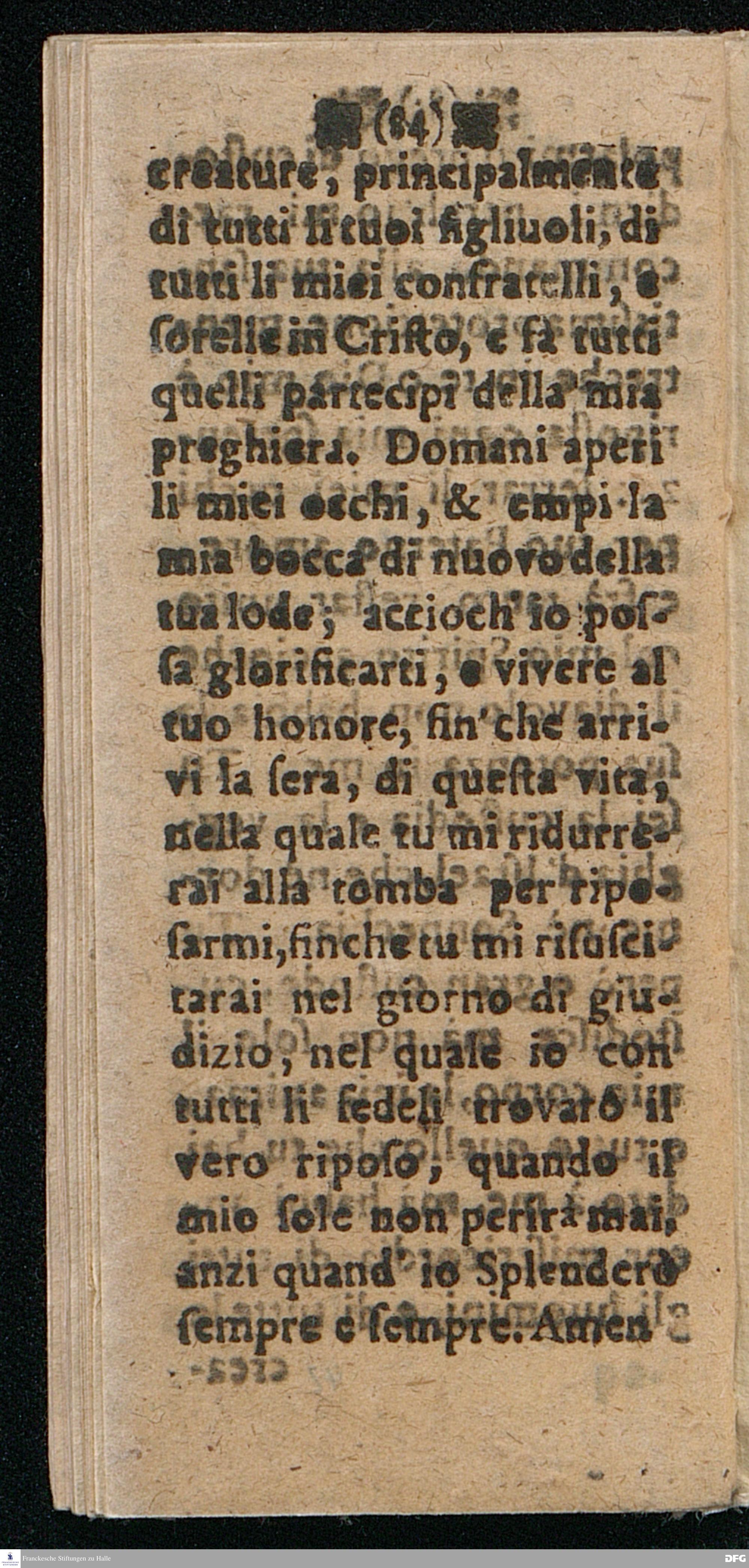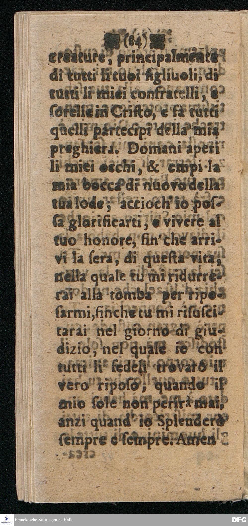 UTILISSIMA DOTTRINA Di bene e piace volmente pregare, Distinta in quattordici Paragrafi ripieni di belle Sentenze e Proverbi della Sacra Scrittura, dell'Evangelio, e de Salmi, Coll'aggiunta delle Preghiere Mattutine e Vepertine, Operate in lingua Todesca dal Molto Reverendo e Dottiss. Sign. Il Signore M. AVGVST. HERM. FRANCHIO, della Lingua Gre. & Orient. P.P. e Pastore in Glauchen vigilantissimo, hora transportata nella proprietà dell' Idioma Toscano all'uso di qualfisa cristiano amatore di Dio e della lingua Italiana dal M. Giorg. Franc. Ludovici, alle proprie Spese Halla