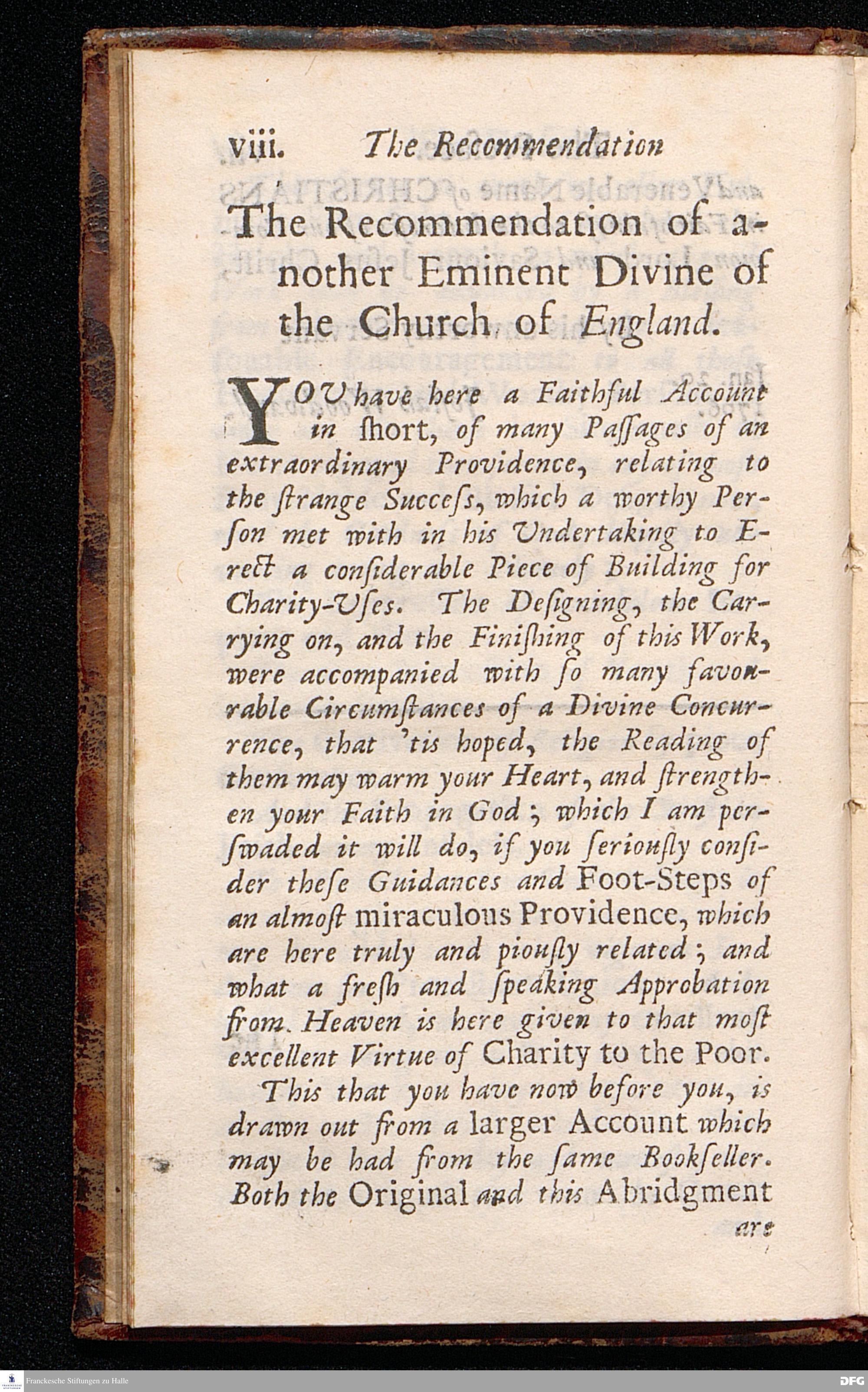 Pietas Hallensis: OR, AN ABSTRACT OF THE Marvellous Footsteps OF Divine Providence, In the Building of a very large HOSPITAL, Or rather, a SPACIOUS COLLEGE, For Charitable and Excellent Uses. And in the Maintaining of many ORPHANS & other POOR PEOPLE therein; At Glaucha near Hall, In the Dominions of the K.of Prussia. Related by the Reverend Augustus Hermannuns Franck[!], Professor of Divinity, and Minister of Glaucha aforesaid. With a PREFACE written by JOSIAH WOODWARD, D.D. And Recommended by some Eminent Divines of the Church of England. To which is added A short History of PIETISM. The Second Edition enlarged. LONDON, Printed and Sold by J.Downing in Bartholomew-Close near West-Smithfield, 1707
