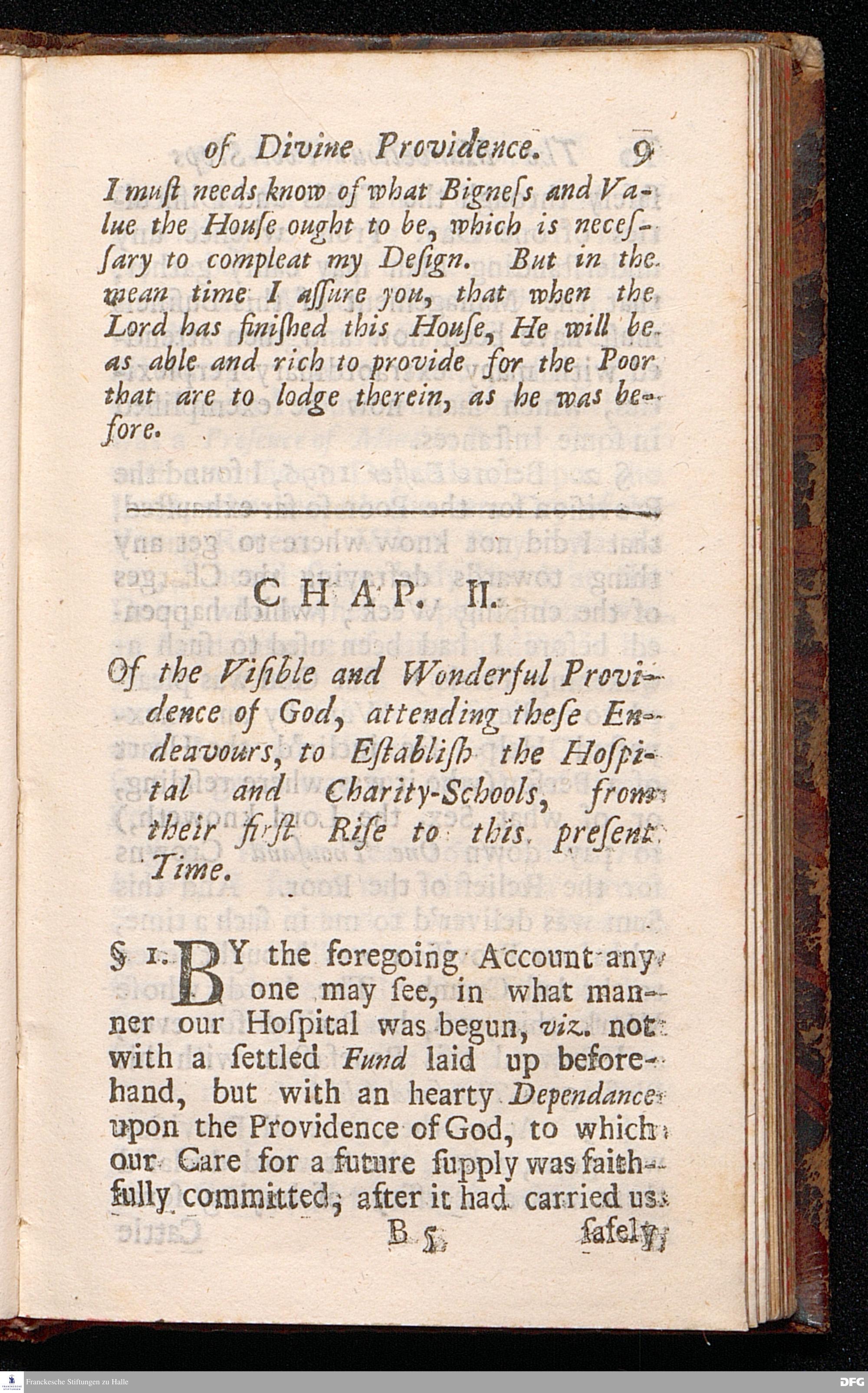 Pietas Hallensis: OR, AN ABSTRACT OF THE Marvellous Footsteps OF Divine Providence, In the Building of a very large HOSPITAL, Or rather, a SPACIOUS COLLEGE, For Charitable and Excellent Uses. And in the Maintaining of many ORPHANS & other POOR PEOPLE therein; At Glaucha near Hall, In the Dominions of the K.of Prussia. Related by the Reverend Augustus Hermannuns Franck[!], Professor of Divinity, and Minister of Glaucha aforesaid. With a PREFACE written by JOSIAH WOODWARD, D.D. And Recommended by some Eminent Divines of the Church of England. To which is added A short History of PIETISM. The Second Edition enlarged. LONDON, Printed and Sold by J.Downing in Bartholomew-Close near West-Smithfield, 1707