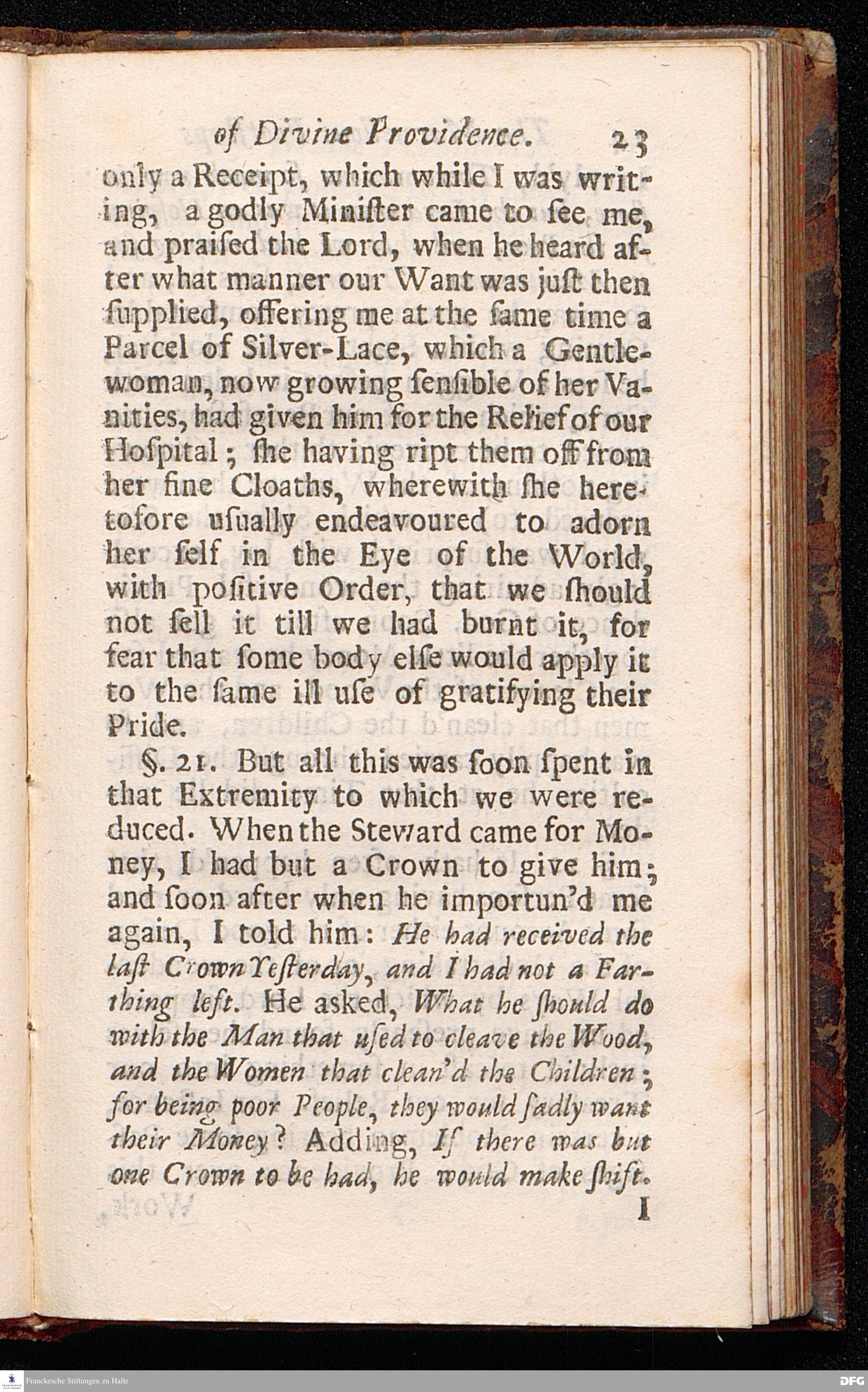 Pietas Hallensis: OR, AN ABSTRACT OF THE Marvellous Footsteps OF Divine Providence, In the Building of a very large HOSPITAL, Or rather, a SPACIOUS COLLEGE, For Charitable and Excellent Uses. And in the Maintaining of many ORPHANS & other POOR PEOPLE therein; At Glaucha near Hall, In the Dominions of the K.of Prussia. Related by the Reverend Augustus Hermannuns Franck[!], Professor of Divinity, and Minister of Glaucha aforesaid. With a PREFACE written by JOSIAH WOODWARD, D.D. And Recommended by some Eminent Divines of the Church of England. To which is added A short History of PIETISM. The Second Edition enlarged. LONDON, Printed and Sold by J.Downing in Bartholomew-Close near West-Smithfield, 1707