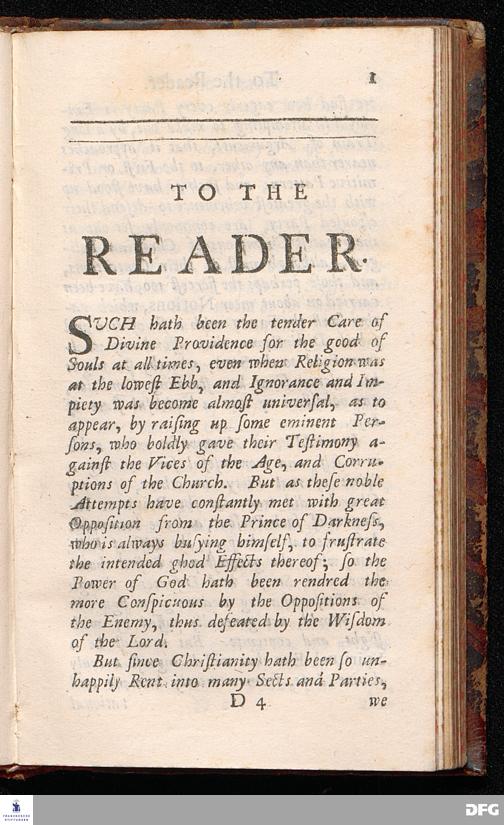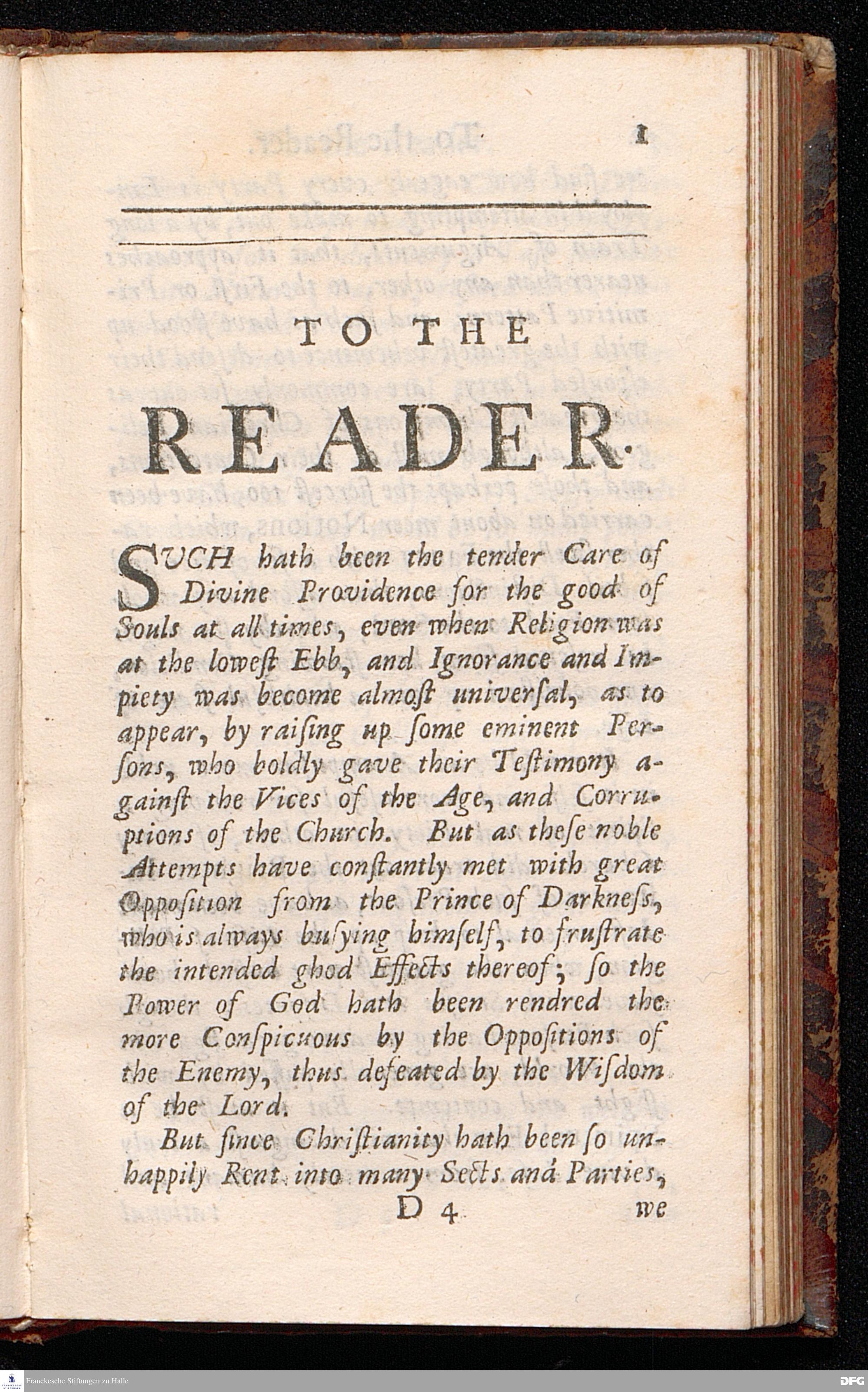Pietas Hallensis: OR, AN ABSTRACT OF THE Marvellous Footsteps OF Divine Providence, In the Building of a very large HOSPITAL, Or rather, a SPACIOUS COLLEGE, For Charitable and Excellent Uses. And in the Maintaining of many ORPHANS & other POOR PEOPLE therein; At Glaucha near Hall, In the Dominions of the K.of Prussia. Related by the Reverend Augustus Hermannuns Franck[!], Professor of Divinity, and Minister of Glaucha aforesaid. With a PREFACE written by JOSIAH WOODWARD, D.D. And Recommended by some Eminent Divines of the Church of England. To which is added A short History of PIETISM. The Second Edition enlarged. LONDON, Printed and Sold by J.Downing in Bartholomew-Close near West-Smithfield, 1707
