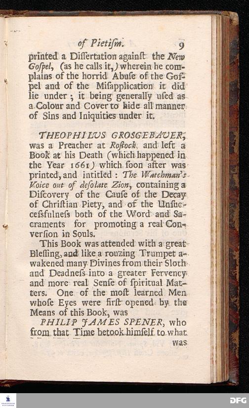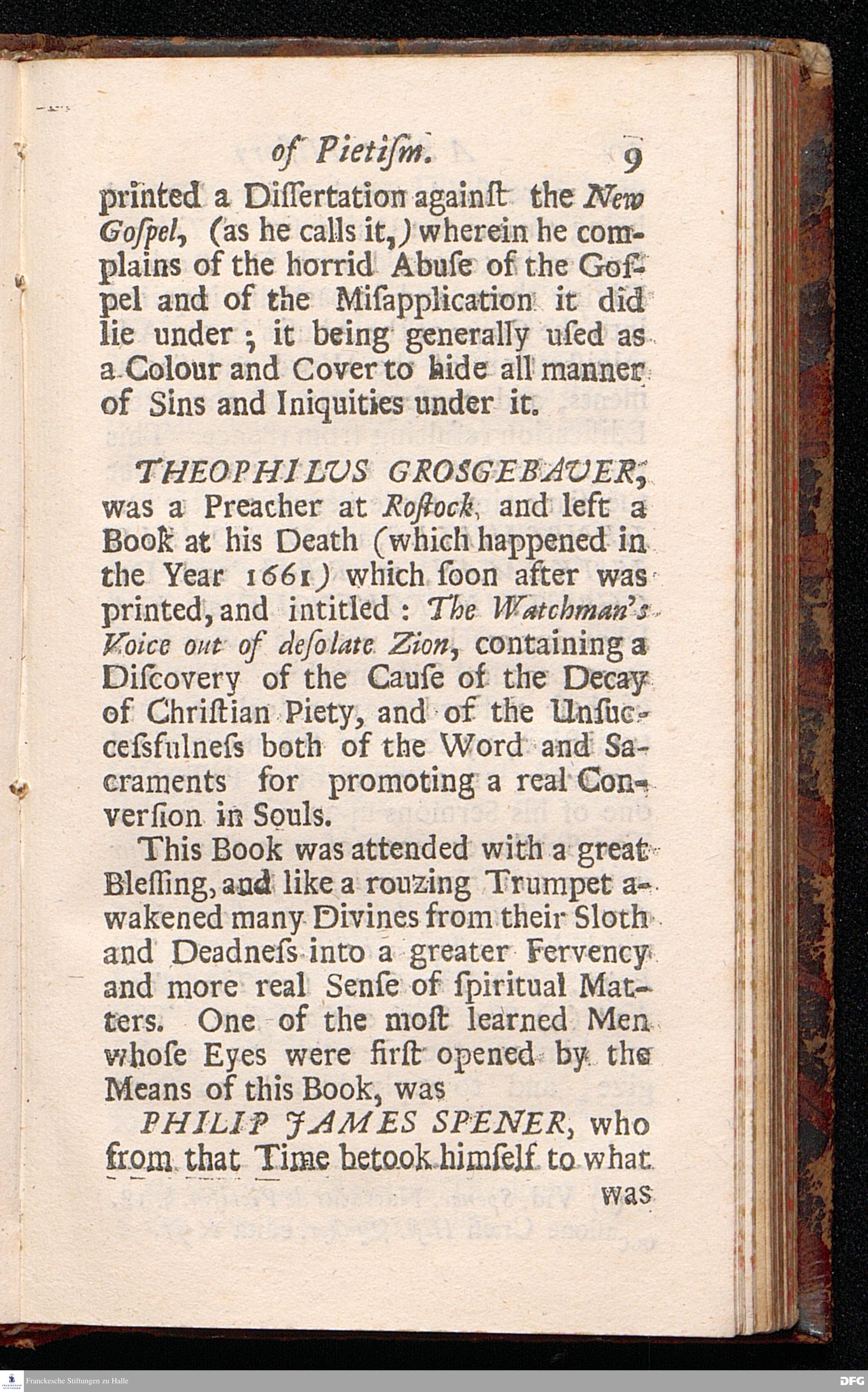 Pietas Hallensis: OR, AN ABSTRACT OF THE Marvellous Footsteps OF Divine Providence, In the Building of a very large HOSPITAL, Or rather, a SPACIOUS COLLEGE, For Charitable and Excellent Uses. And in the Maintaining of many ORPHANS & other POOR PEOPLE therein; At Glaucha near Hall, In the Dominions of the K.of Prussia. Related by the Reverend Augustus Hermannuns Franck[!], Professor of Divinity, and Minister of Glaucha aforesaid. With a PREFACE written by JOSIAH WOODWARD, D.D. And Recommended by some Eminent Divines of the Church of England. To which is added A short History of PIETISM. The Second Edition enlarged. LONDON, Printed and Sold by J.Downing in Bartholomew-Close near West-Smithfield, 1707