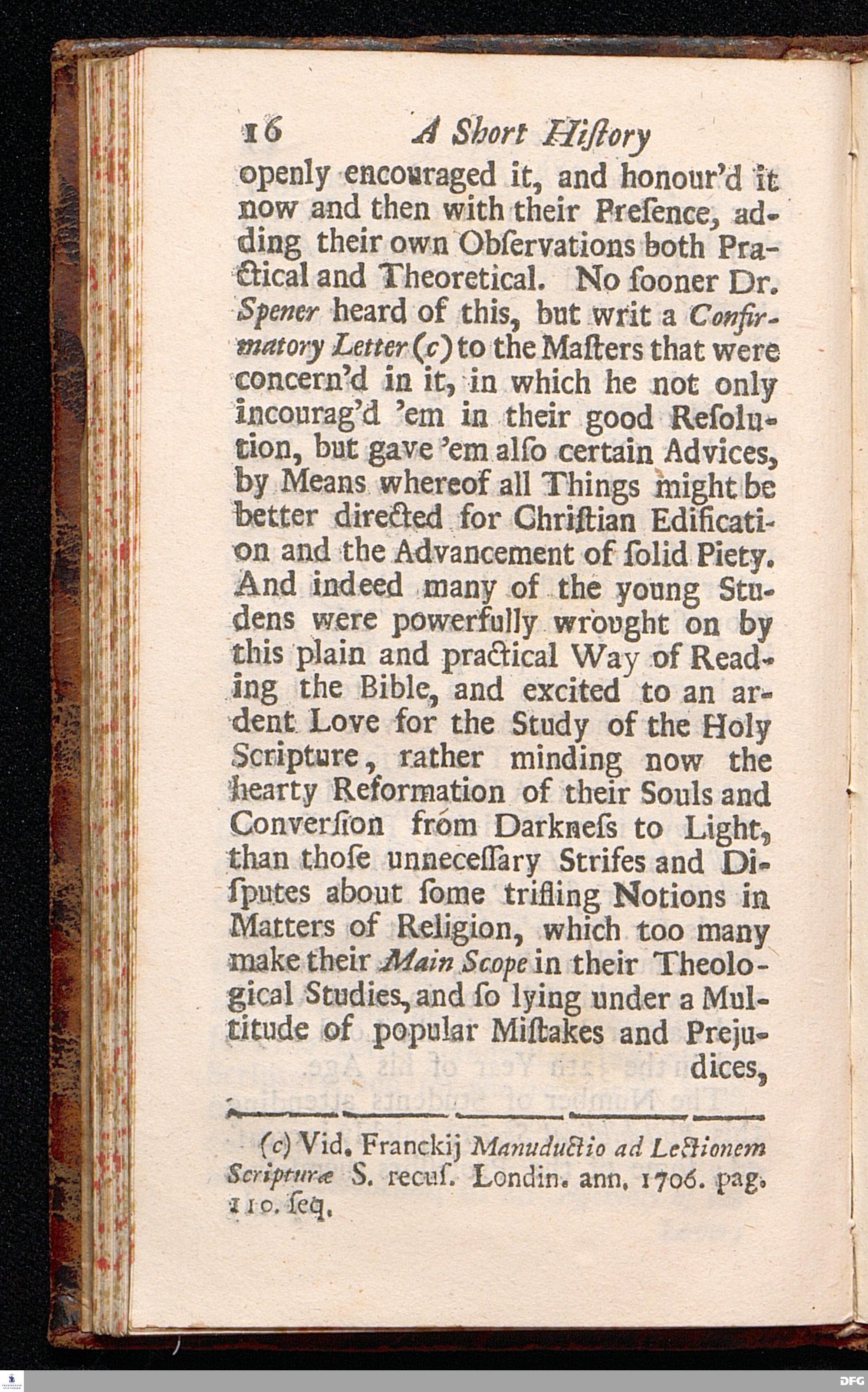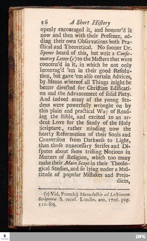 Pietas Hallensis: OR, AN ABSTRACT OF THE Marvellous Footsteps OF Divine Providence, In the Building of a very large HOSPITAL, Or rather, a SPACIOUS COLLEGE, For Charitable and Excellent Uses. And in the Maintaining of many ORPHANS & other POOR PEOPLE therein; At Glaucha near Hall, In the Dominions of the K.of Prussia. Related by the Reverend Augustus Hermannuns Franck[!], Professor of Divinity, and Minister of Glaucha aforesaid. With a PREFACE written by JOSIAH WOODWARD, D.D. And Recommended by some Eminent Divines of the Church of England. To which is added A short History of PIETISM. The Second Edition enlarged. LONDON, Printed and Sold by J.Downing in Bartholomew-Close near West-Smithfield, 1707