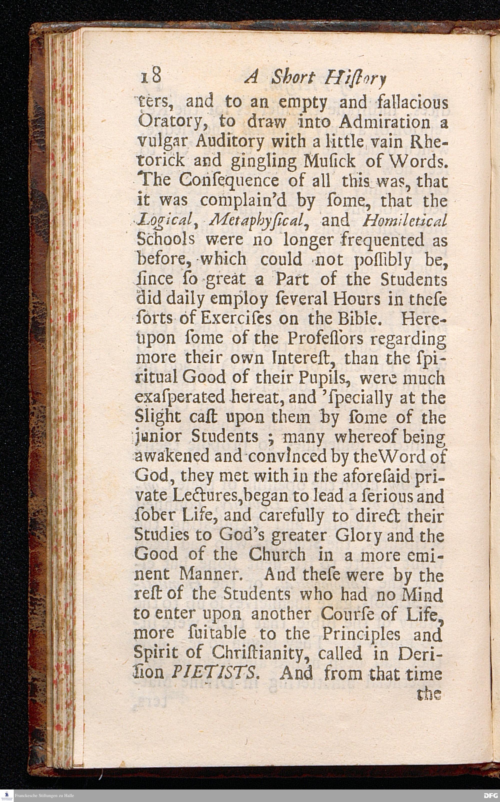 Pietas Hallensis: OR, AN ABSTRACT OF THE Marvellous Footsteps OF Divine Providence, In the Building of a very large HOSPITAL, Or rather, a SPACIOUS COLLEGE, For Charitable and Excellent Uses. And in the Maintaining of many ORPHANS & other POOR PEOPLE therein; At Glaucha near Hall, In the Dominions of the K.of Prussia. Related by the Reverend Augustus Hermannuns Franck[!], Professor of Divinity, and Minister of Glaucha aforesaid. With a PREFACE written by JOSIAH WOODWARD, D.D. And Recommended by some Eminent Divines of the Church of England. To which is added A short History of PIETISM. The Second Edition enlarged. LONDON, Printed and Sold by J.Downing in Bartholomew-Close near West-Smithfield, 1707