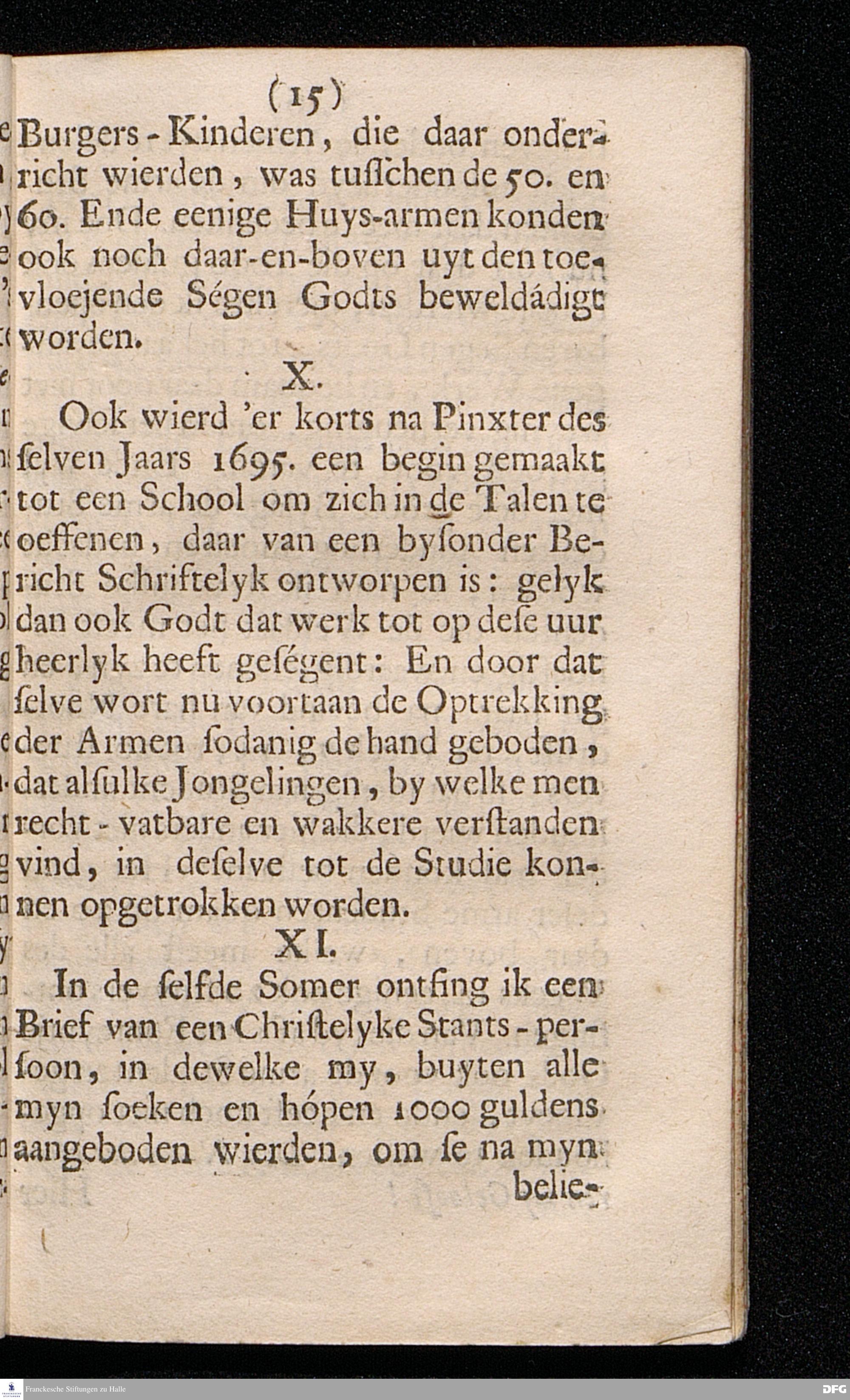 KORTE BESCHRYVING Van het onlangs opgerechte WEES-HUYS tot HALLE In't Hertogdom Maagdenburg Hoe het selve begonnen, en tegenwoortig gestelt is: Tot Prys van Gods trouwe Voorsorg, Tot verstercking van het vertrouwen op God, En tot verwecking van ware Christelyke Liefde; In't Hoogduyts opgestelt Door AUGUST HERMAN[!] FRANCKEN, Professor in de Griexsche en Orientaalsche Spraken, ende Leeraar aldaar. Beneffens twee Attestatien voor den Collecteerder. Uit het Hoogduyts in't Hollants overgeset. t'AMSTERDAM, By Johannes Smets en Paulus Dibbits, Boekdrukkers op de Nieuwe zyts Achterburgwal, 1697