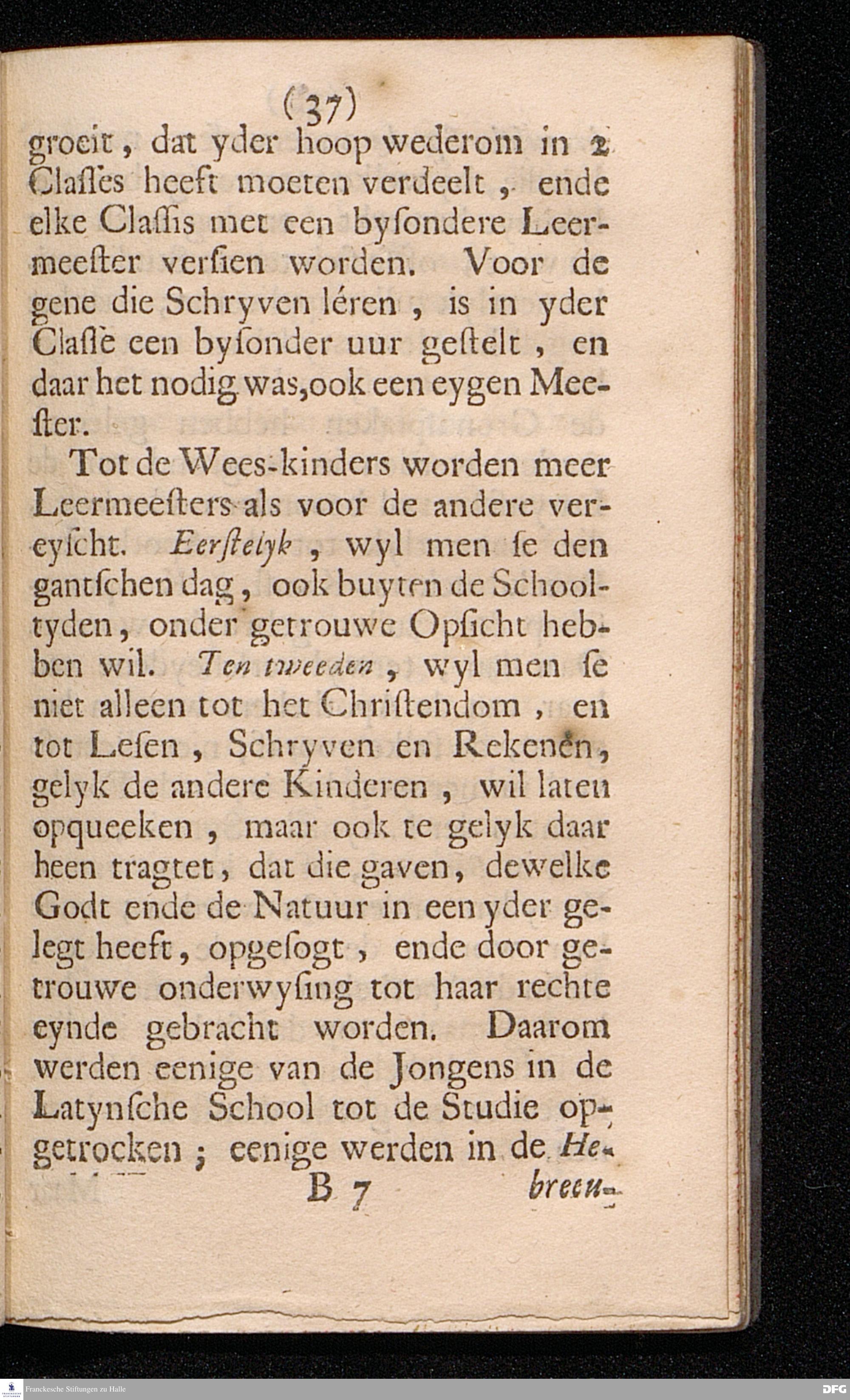 KORTE BESCHRYVING Van het onlangs opgerechte WEES-HUYS tot HALLE In't Hertogdom Maagdenburg Hoe het selve begonnen, en tegenwoortig gestelt is: Tot Prys van Gods trouwe Voorsorg, Tot verstercking van het vertrouwen op God, En tot verwecking van ware Christelyke Liefde; In't Hoogduyts opgestelt Door AUGUST HERMAN[!] FRANCKEN, Professor in de Griexsche en Orientaalsche Spraken, ende Leeraar aldaar. Beneffens twee Attestatien voor den Collecteerder. Uit het Hoogduyts in't Hollants overgeset. t'AMSTERDAM, By Johannes Smets en Paulus Dibbits, Boekdrukkers op de Nieuwe zyts Achterburgwal, 1697