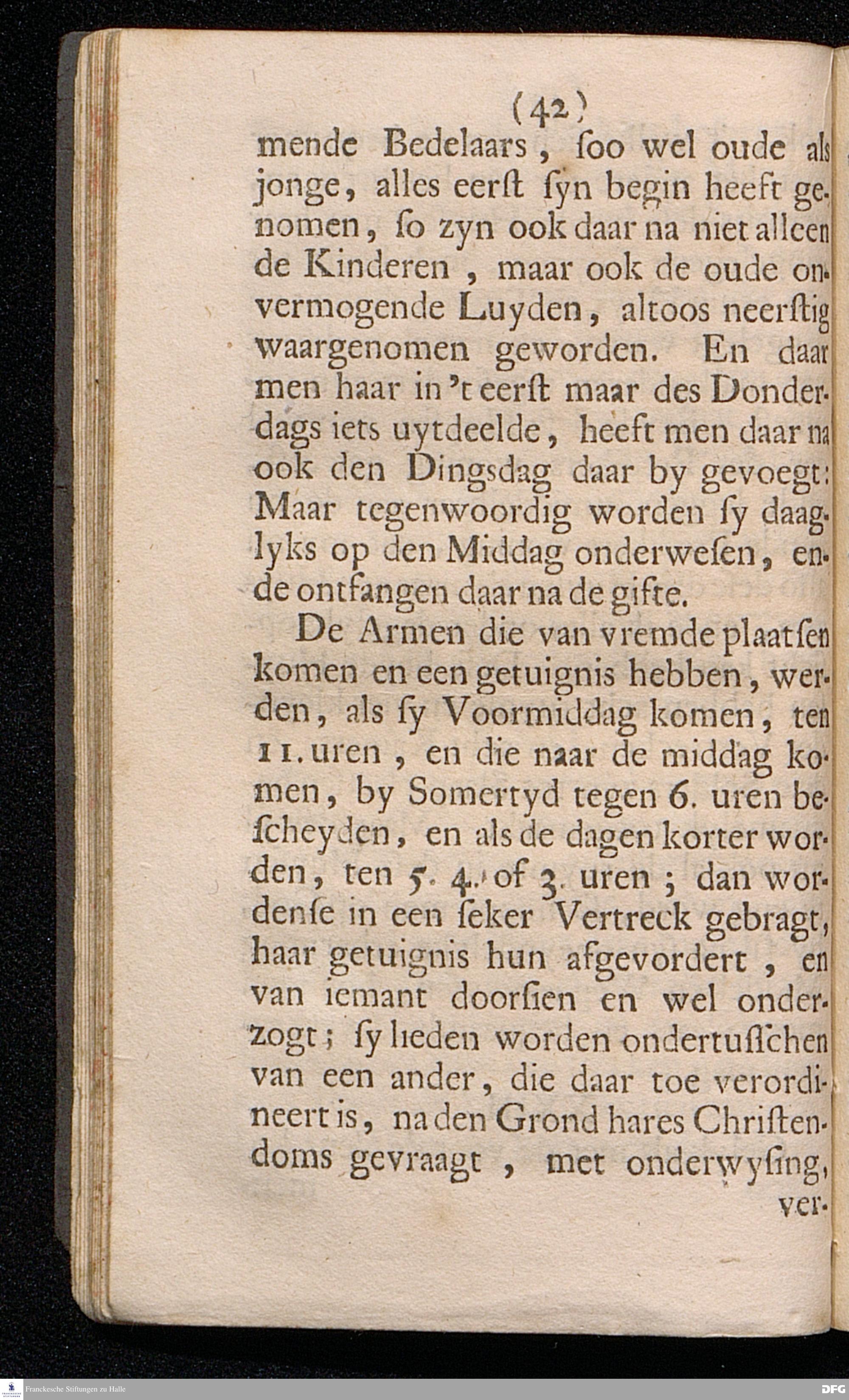 KORTE BESCHRYVING Van het onlangs opgerechte WEES-HUYS tot HALLE In't Hertogdom Maagdenburg Hoe het selve begonnen, en tegenwoortig gestelt is: Tot Prys van Gods trouwe Voorsorg, Tot verstercking van het vertrouwen op God, En tot verwecking van ware Christelyke Liefde; In't Hoogduyts opgestelt Door AUGUST HERMAN[!] FRANCKEN, Professor in de Griexsche en Orientaalsche Spraken, ende Leeraar aldaar. Beneffens twee Attestatien voor den Collecteerder. Uit het Hoogduyts in't Hollants overgeset. t'AMSTERDAM, By Johannes Smets en Paulus Dibbits, Boekdrukkers op de Nieuwe zyts Achterburgwal, 1697